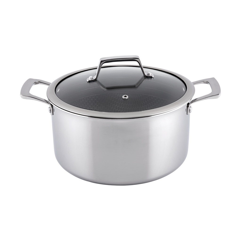 Tack vare 3-skiktsdesignen i rostfritt stål fördelas värmen snabbt och jämnt, vilket ger konsekvent tillagning oavsett mängd. Den slitstarka hybridbeläggningen bidrar till lång livslängd och smidig användning – med eller utan fett. Grytan är ugnssäker upp till 260 °C (utan lock) och klarar upp till 400 °C på spisen, vilket ger dig maximal flexibilitet.
