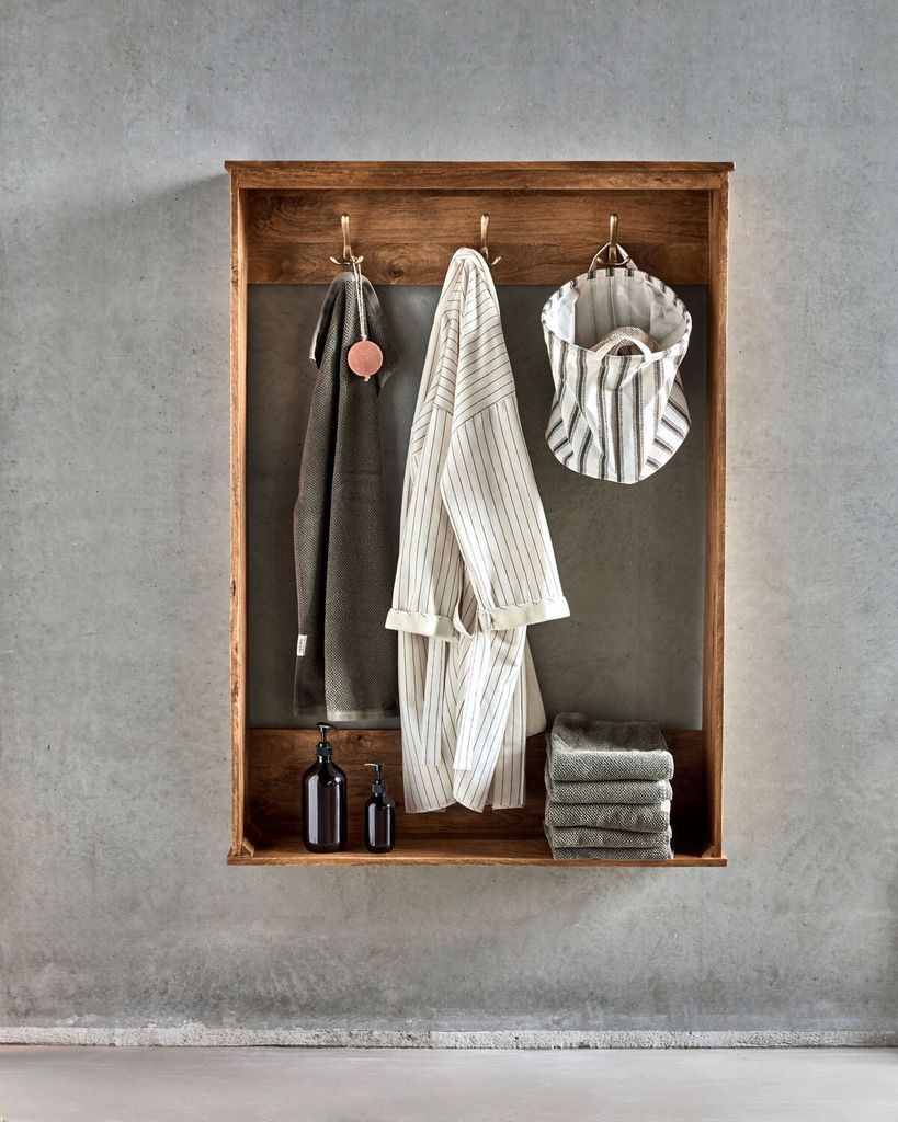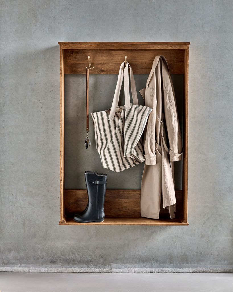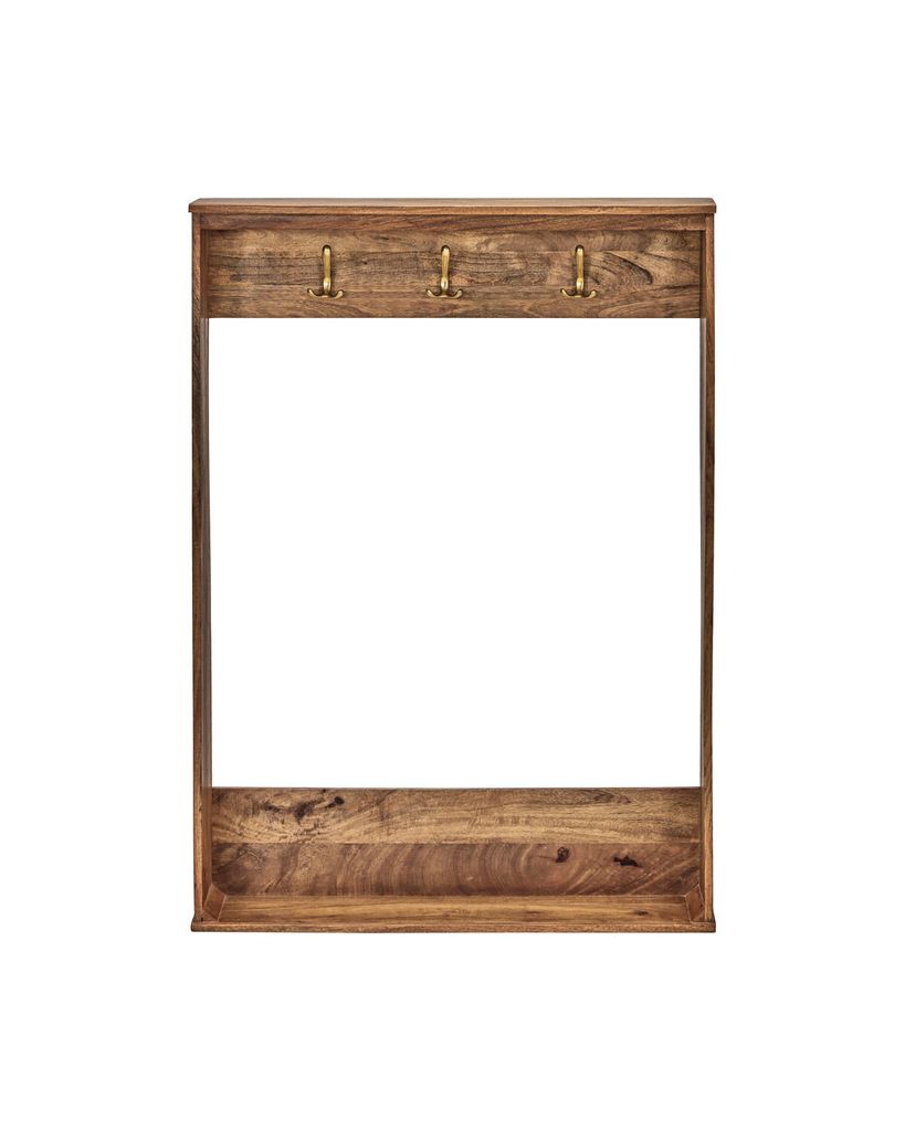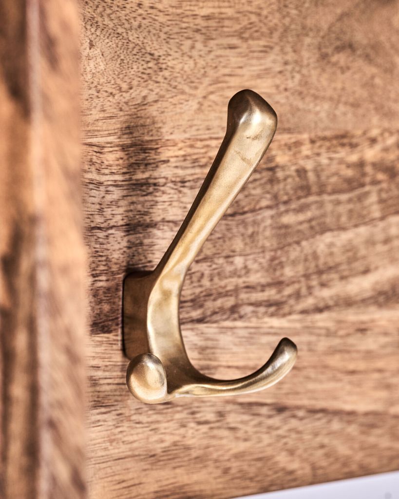 House Doctor Balance klädhängare är en kombination av stil och funktionalitet, tillverkad av hållbart mangoträ med en elegant antikbrun finish. Dess tidlösa design med raffinerade räfflade sidopaneler gör den till en sofistikerad lösning för att organisera ytterkläder, korgar och väskor. Klädhängaren har tre robusta krokar i mässingsfärg, vilket ger en praktisk och estetiskt tilltalande förvaringsmöjlighet i både hallen och sovrummet. Låt denna vackra klädhängare bli en del av din inredning och skapa en välkomnande och organiserad atmosfär i ditt hem.