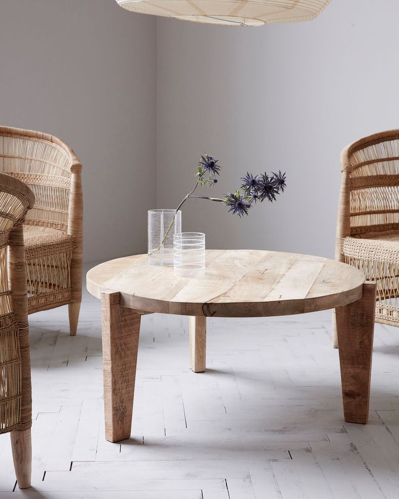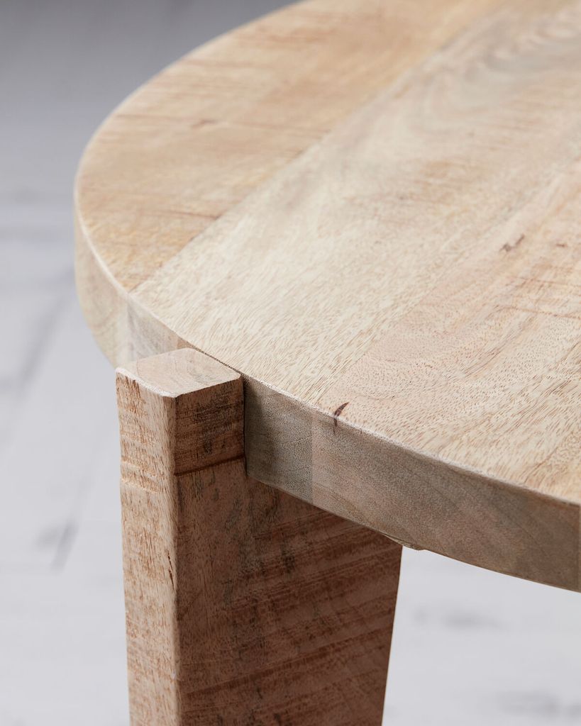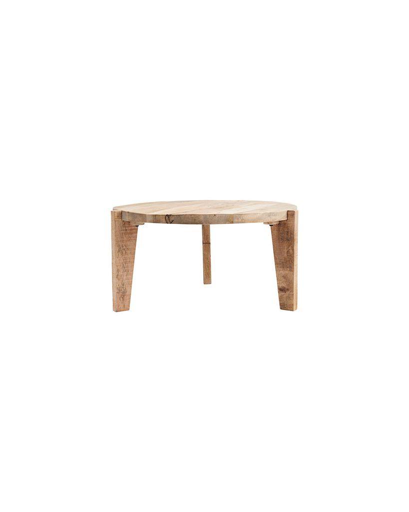 Elegant soffbord i mangoträ med rund form och robusta ben. Perfekt för en modern touch i vardagsrummet.