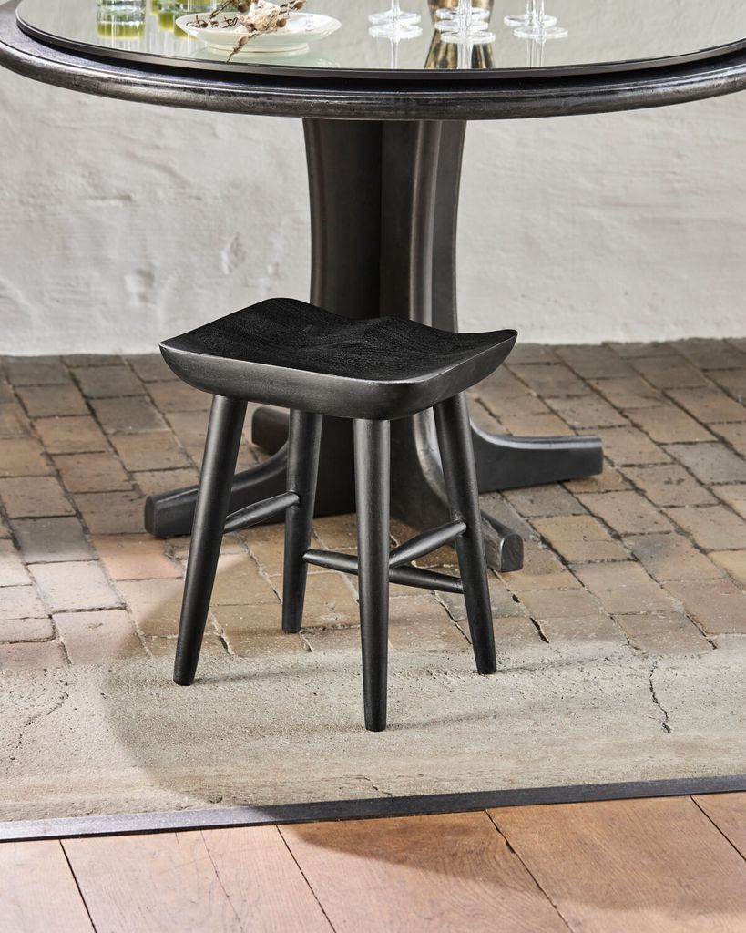 Elegant svart barpall i mangoträ med stödjande fotstöd. Perfekt för kök eller matbord.