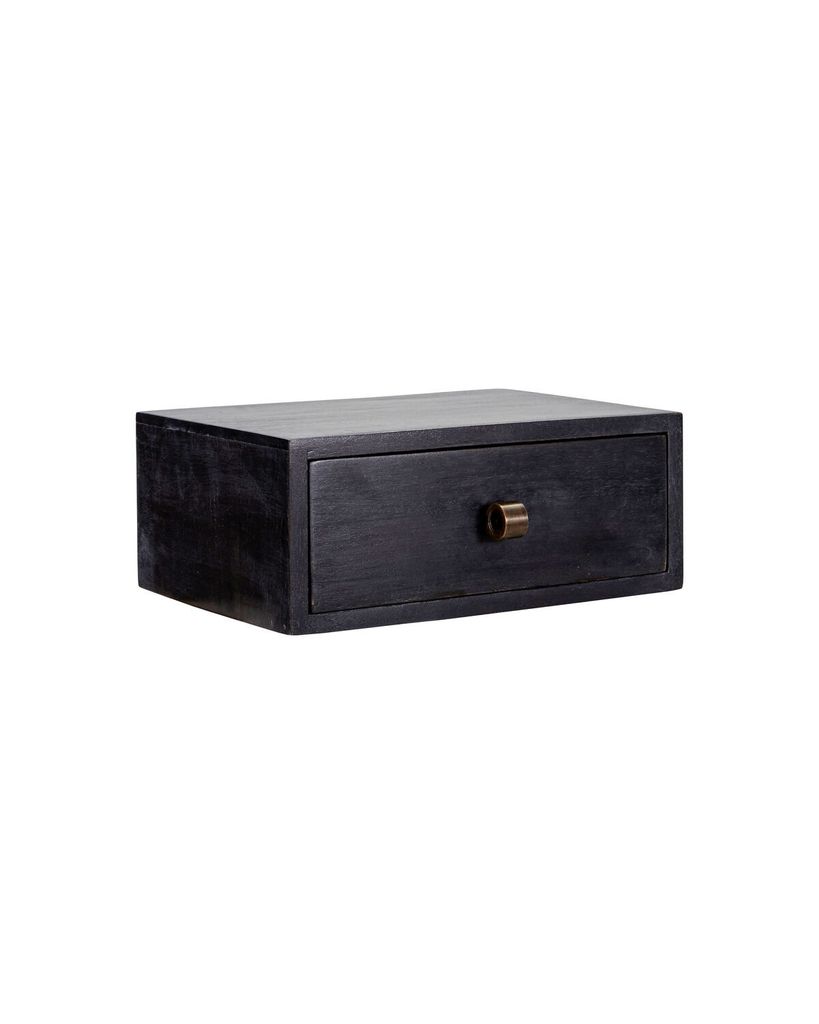 House Doctor Bedsi hylla i svart är en mångsidig och elegant förvaringslösning. Tillverkad av robust mangoträ, den erbjuder både stil och funktionalitet. En praktisk låda ger dig plats för småsaker, medan den släta ytan erbjuder utrymme för dekorationer som en ljusstake eller vas. Den stilrena designen med en elegant metallknopp i guldton ger ett sofistikerat intryck, perfekt för alla rum i hemmet - från sovrummet till hallen. Monteras enkelt på väggen och sparar värdefull golvyta.