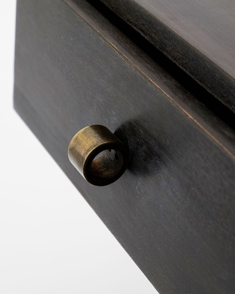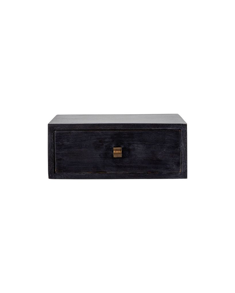 Elegant väggmonterad hylla i svart mangoträ med praktisk låda och stilren design.