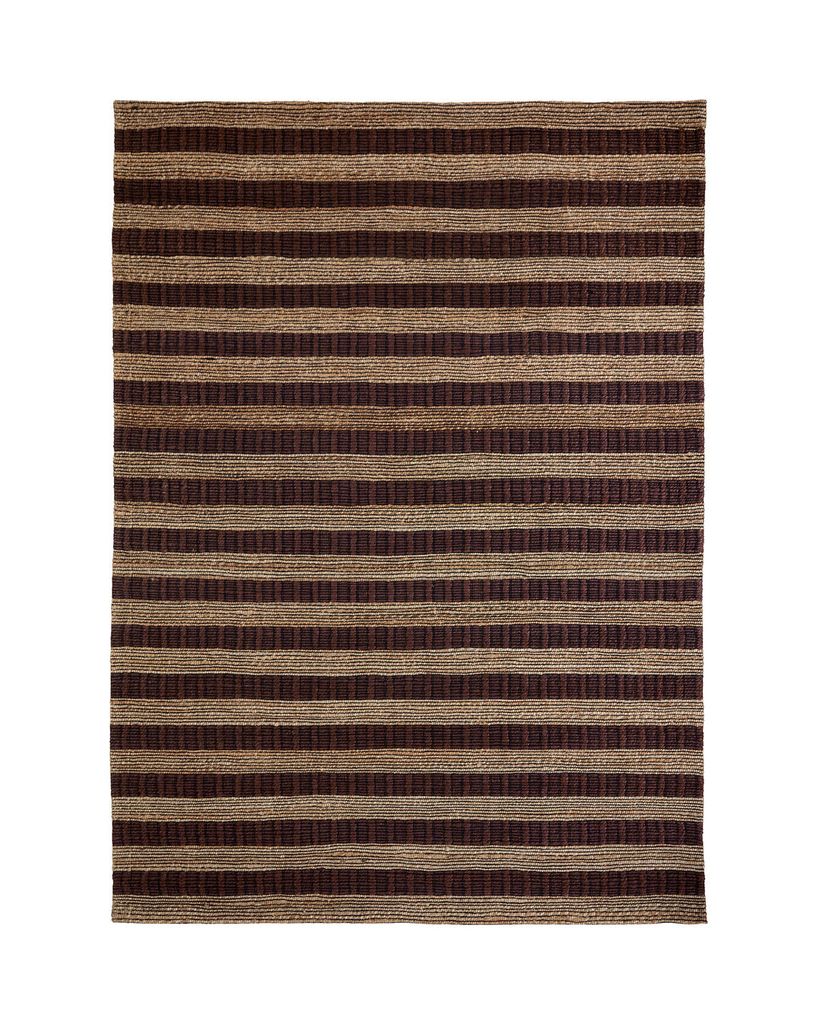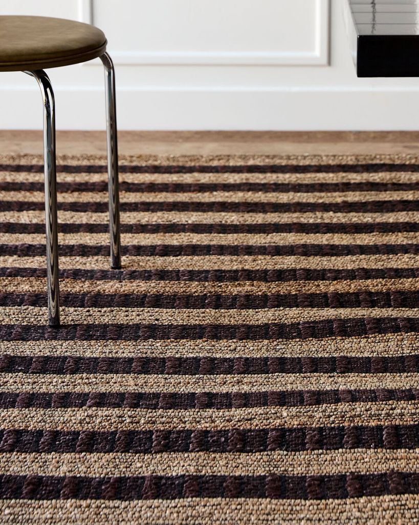 Handvävd matta med bruna och naturfärgade ränder, tillverkad av jute för en varm och inbjudande atmosfär.