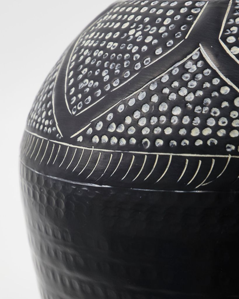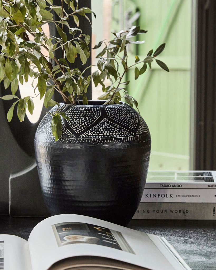 Ge ditt hem en konstnärlig touch med House Doctor Bloss vas i svart. Den här handgjorda vasen utmärker sig genom sitt unika reliefmönster som ger varje exemplar en personlig prägel. Med sin eleganta svarta finish blir den ett iögonfallande inslag i alla rum. Perfekt för att visa upp stora buketter eller grenar, tillför den både värme och personlighet till din interiör. En idealisk dekoration som harmoniserar stil och funktion.