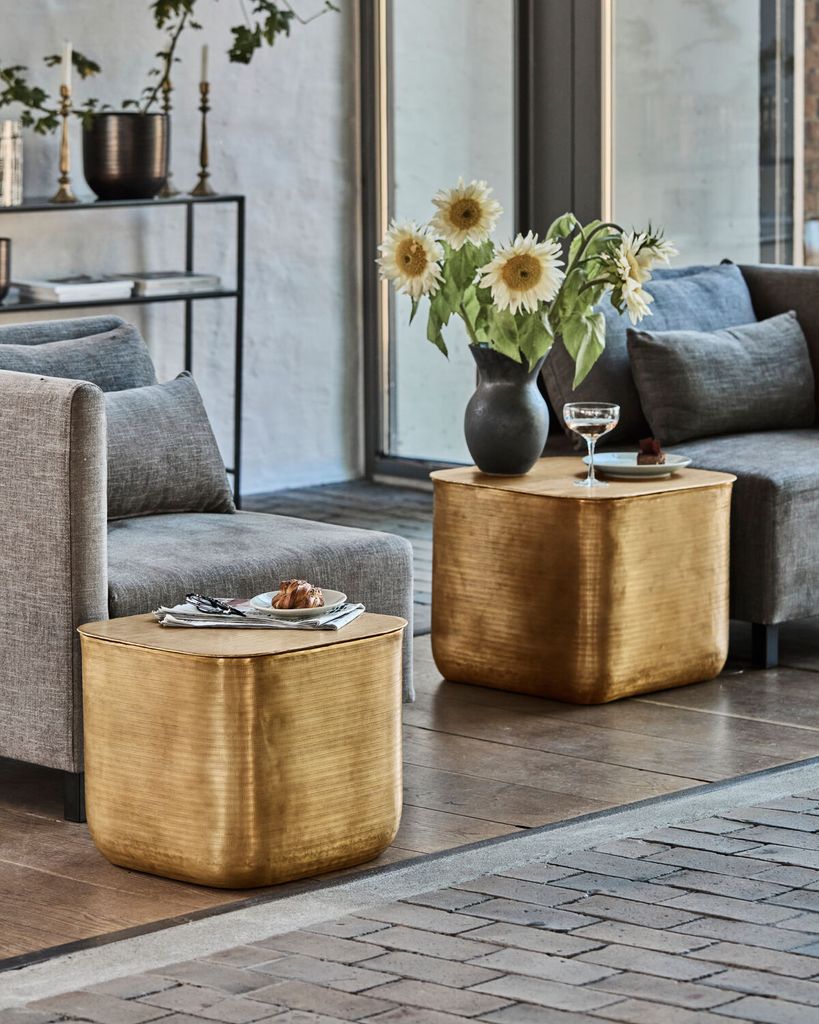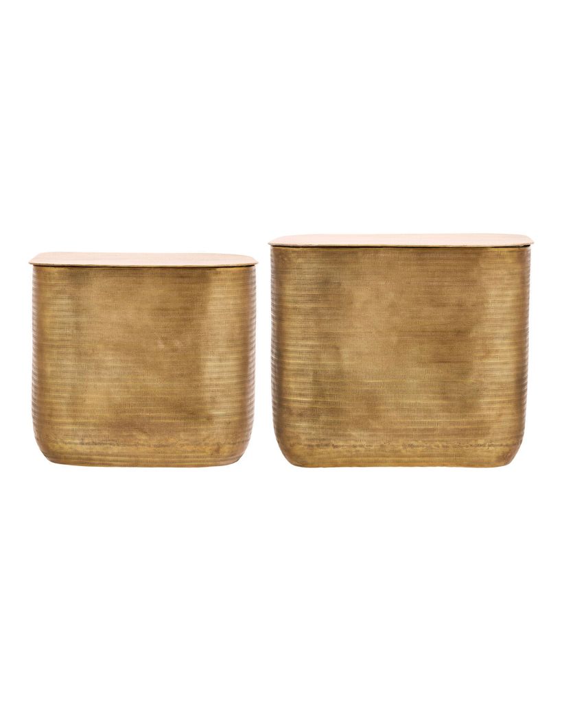 Fördjupa ditt vardagsrum i elegans med House Doctor Cajas sidobord, en uppsättning av två handgjorda bord i vacker antik guldfinish. Dessa bord kombinerar modern estetik med en etnisk känsla och är tillverkade av aluminium och järn, vilket säkerställer både hållbarhet och stil. Det präglade mönstret ger en unik textur och de dolda förvaringsutrymmena under locken erbjuder praktiska lösningar för att organisera ditt hem. Med sin gyllene ton och unika design är dessa bord ett mångsidigt och iögonfallande tillskott till alla inredningar.