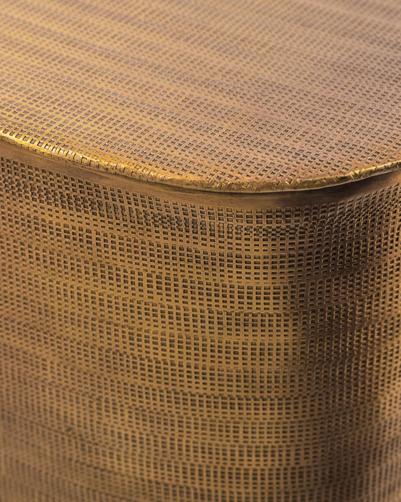 Elegant sidobord i antik guldfinish med präglat mönster. Handgjord i aluminium och järn, erbjuder dolda förvaringsmöjligheter.