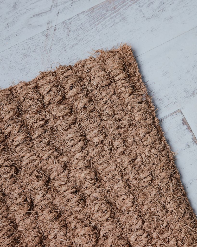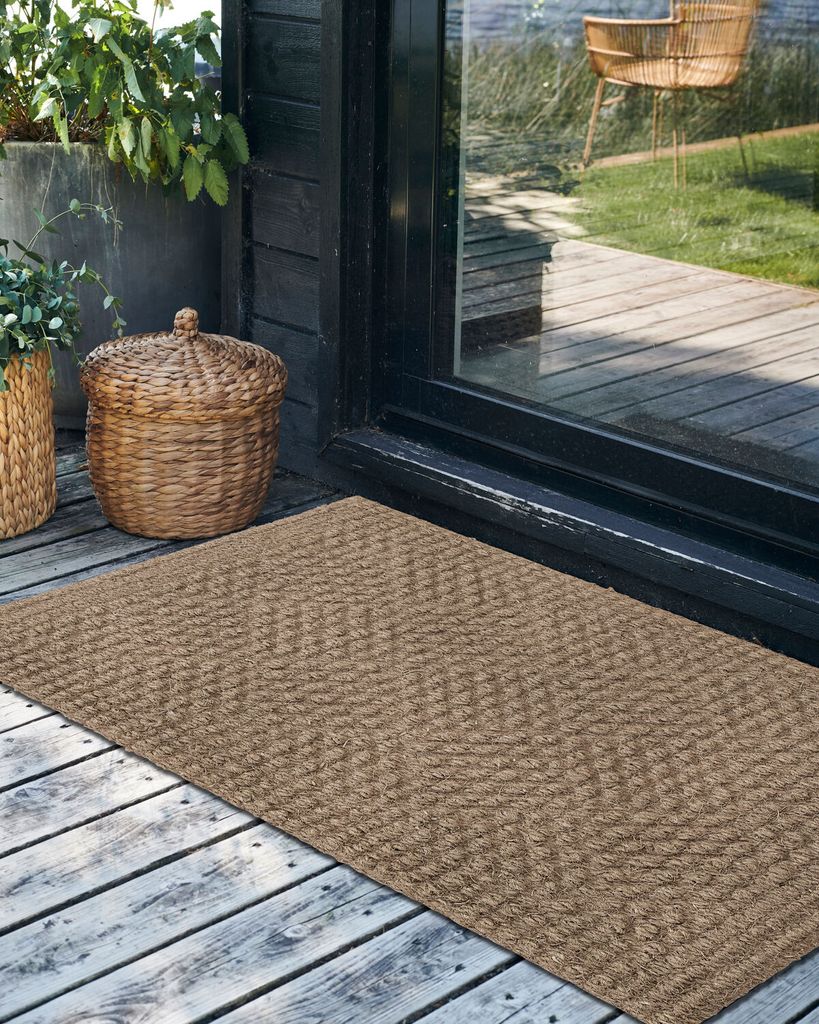 Robust dörrmatta i naturfärg med subtilt mönster, tillverkad av slitstarka kokosfibrer. Perfekt för både inomhus och utomhusbruk.