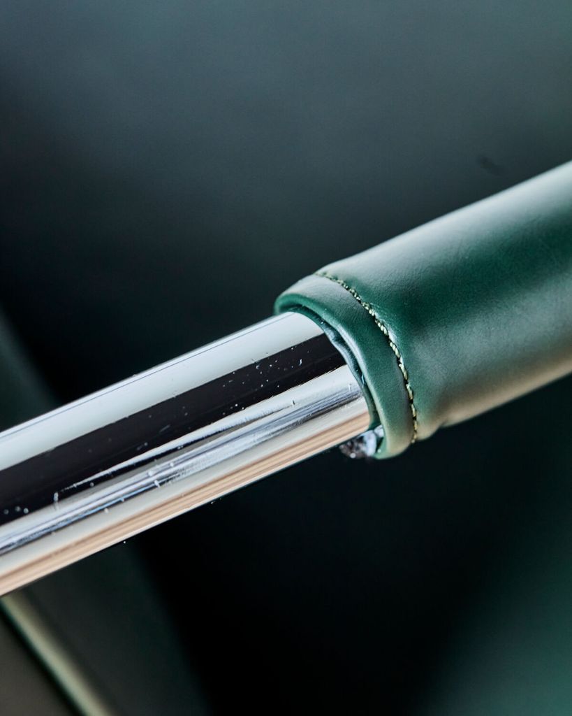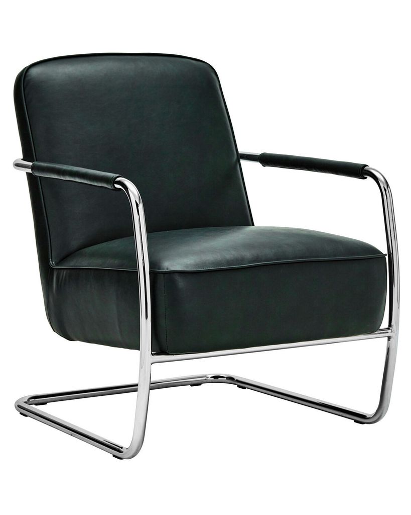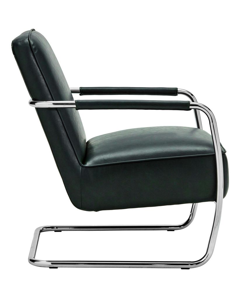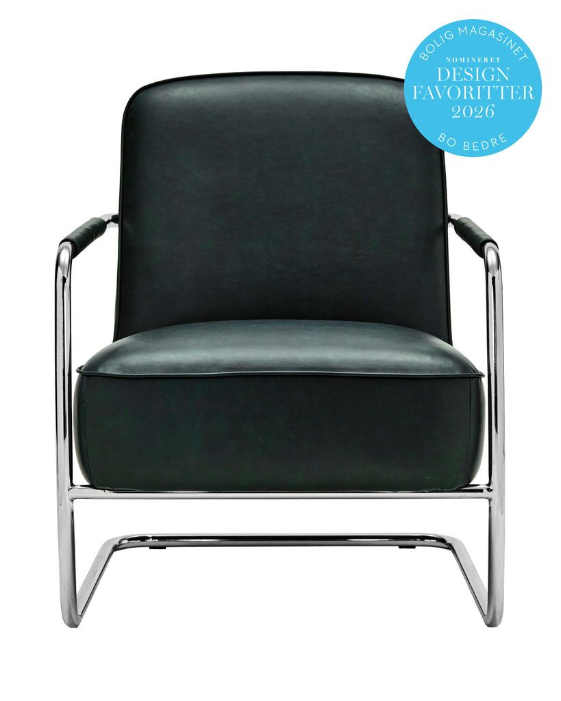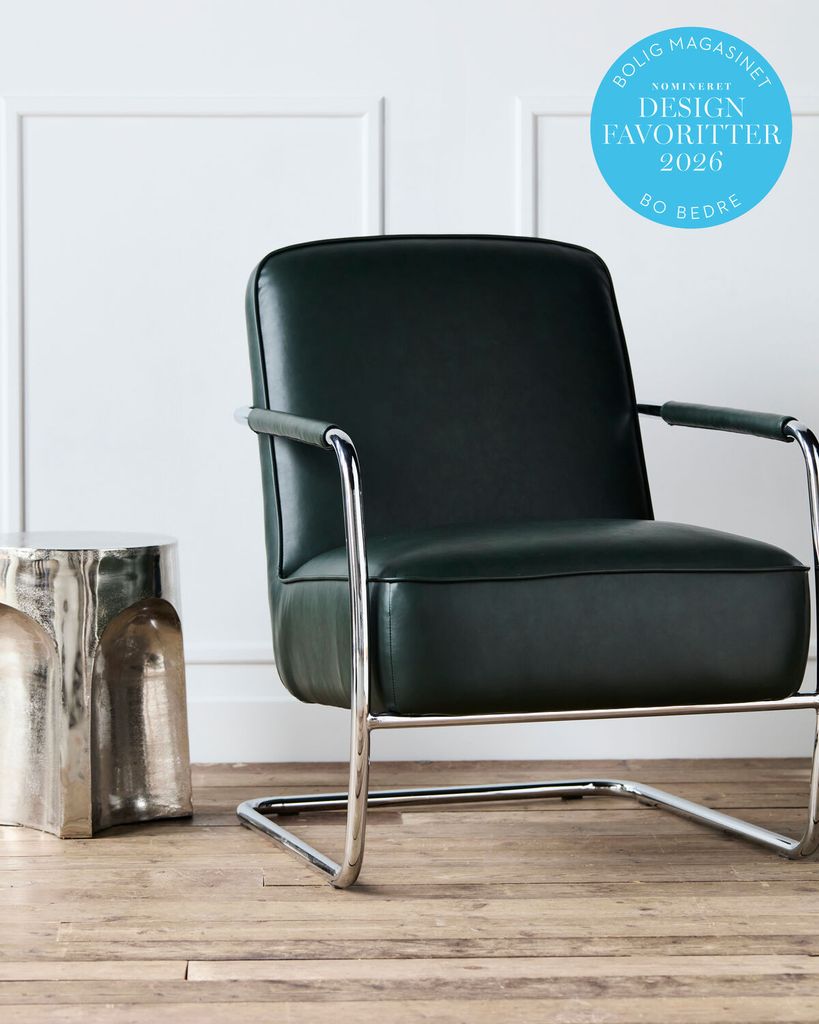 Upplev sofistikerad komfort med vår House Doctor Comma Fåtölj i mörkgrön läderlook och elegant kromstativ.