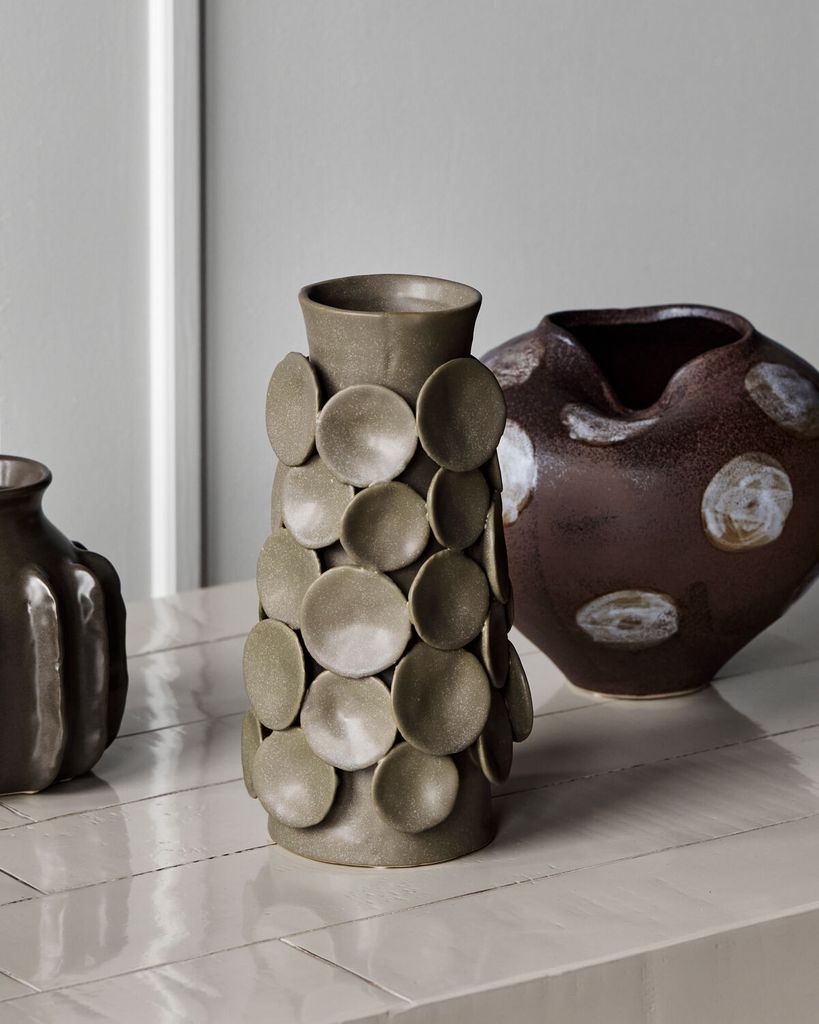 Skapa ett konstnärligt blickfång med House Doctor Dot Vas Khaki. Denna handgjorda vas i stengods har en iögonfallande cirkeldesign som ger en elegant och unik karaktär. Den stilrena khakifärgen kompletterar varje blomsterarrangemang och förvandlar även de enklaste kvistar till en konstinstallation. Placera vasen som ett skulpturalt element i ditt hem, med eller utan blommor, och förstärk din personliga inredningsstil. Den subtilt texturerade ytan och den harmoniska färgtonen gör denna vas till ett tidlöst tillskott i varje rum.