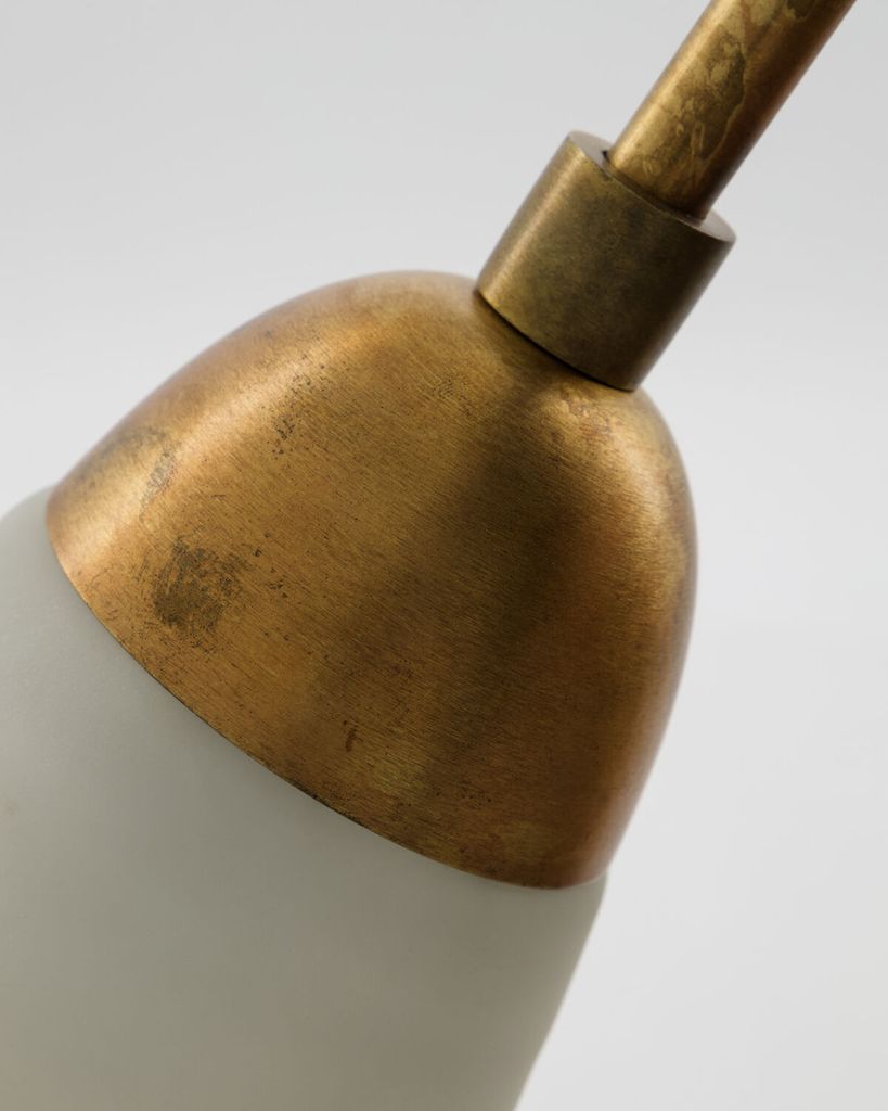 Skapa stämning med denna eleganta vägglampa i antik mässing och opalglasskärm, perfekt för stilfull inredning.