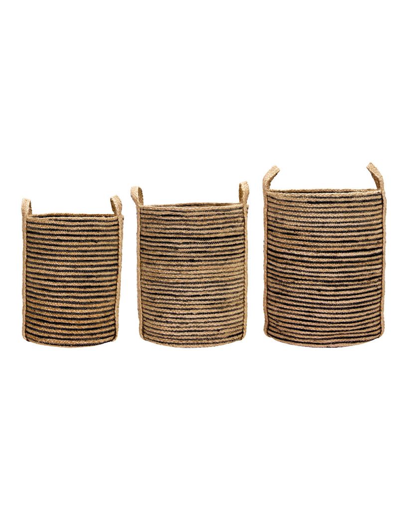 Elegant set av tre handgjorda jute-korgar med svarta ränder för stilfull och flexibel förvaring.