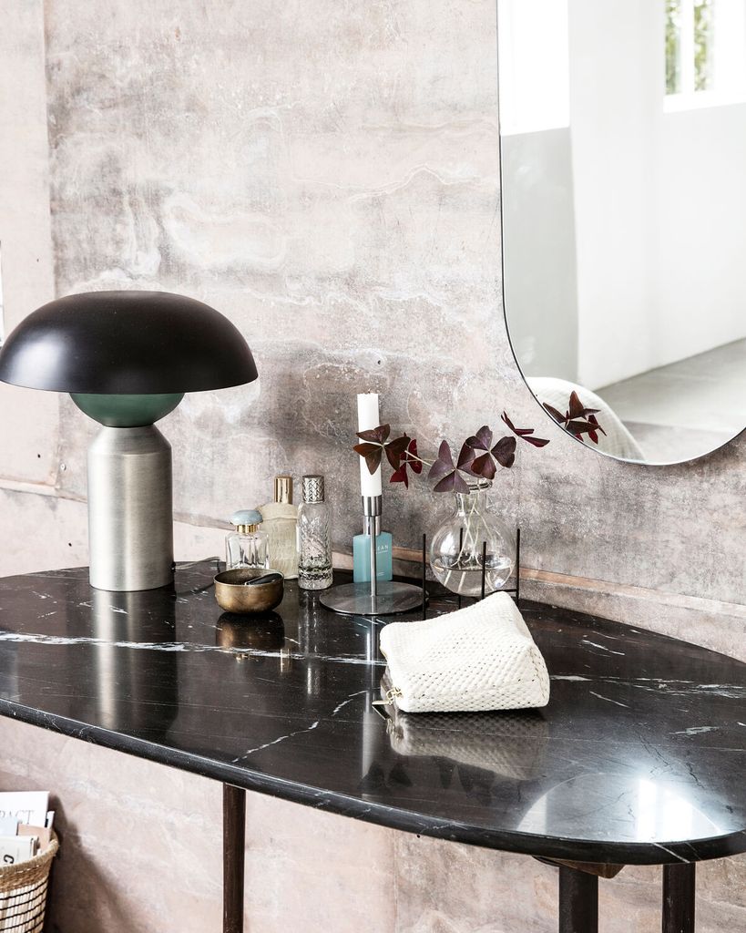 Elegant skrivbord med svart marmor och järn för stilfulla hemmakontor.