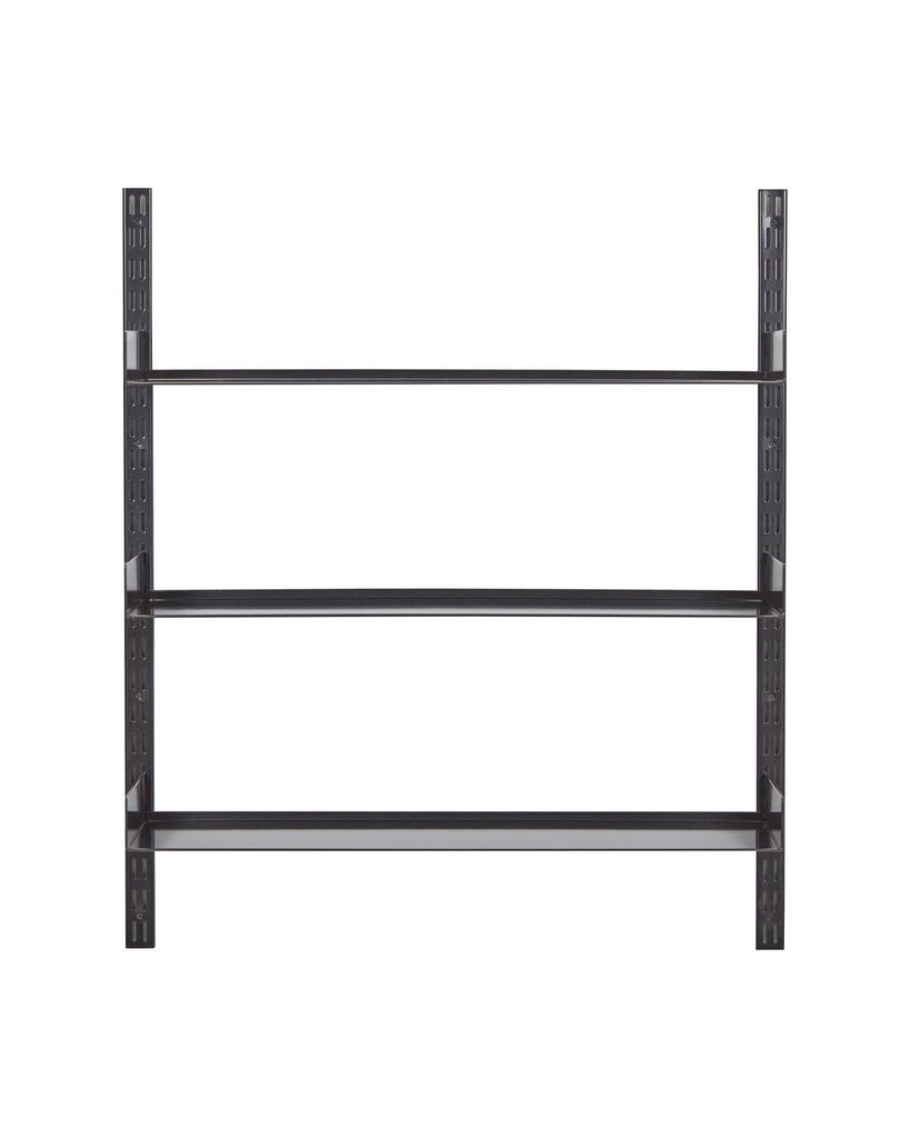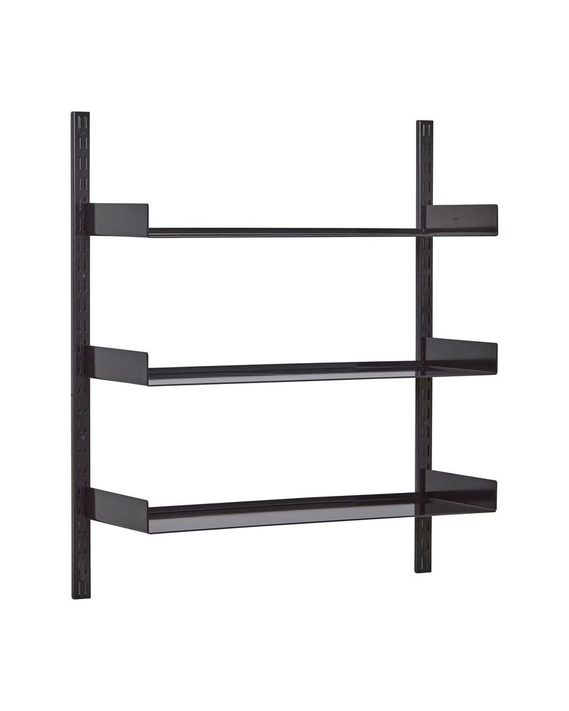 Tidlöst svart hyllsystem i slitstarkt stål med justerbara hyllor för alla rum.