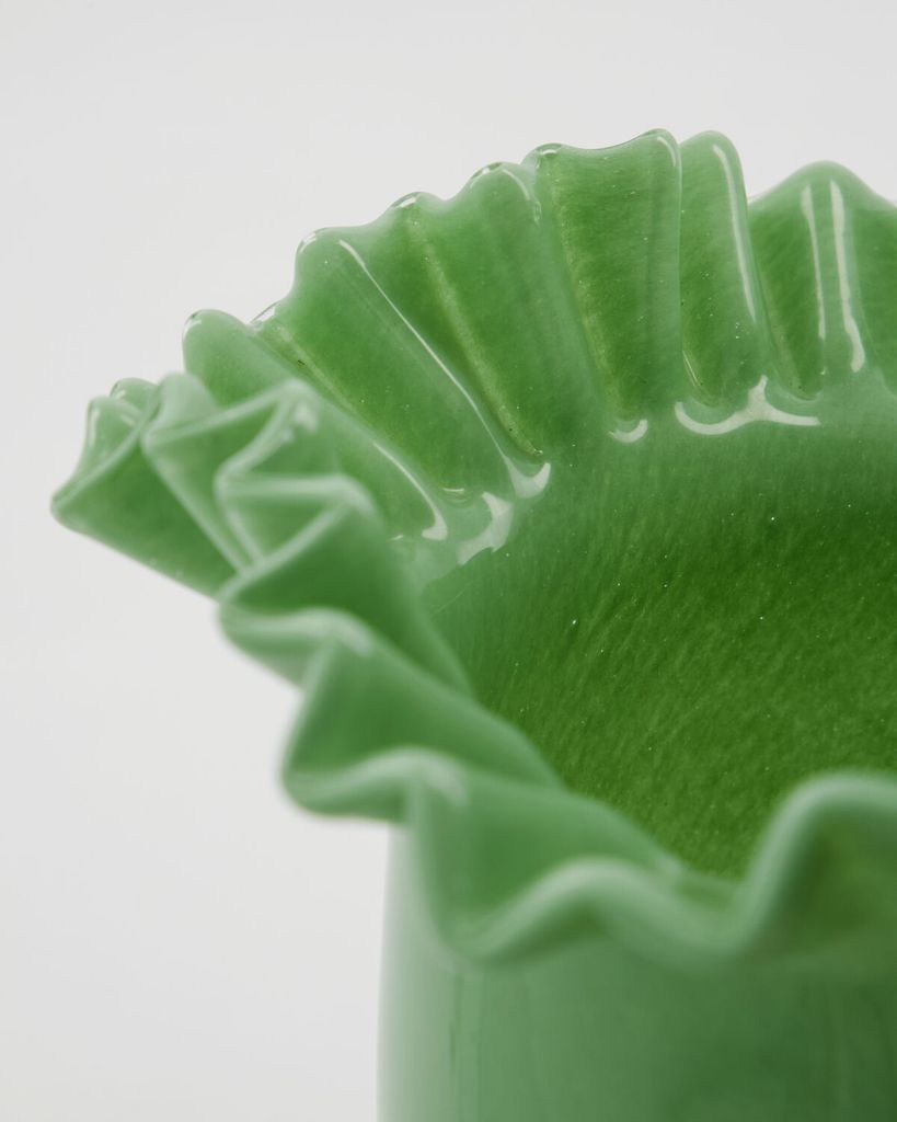 Den handgjorda House Doctor Flee vasen i grön glas kombinerar elegant slät yta med en skulptural, böljande kant för en unik inredningsdetalj.