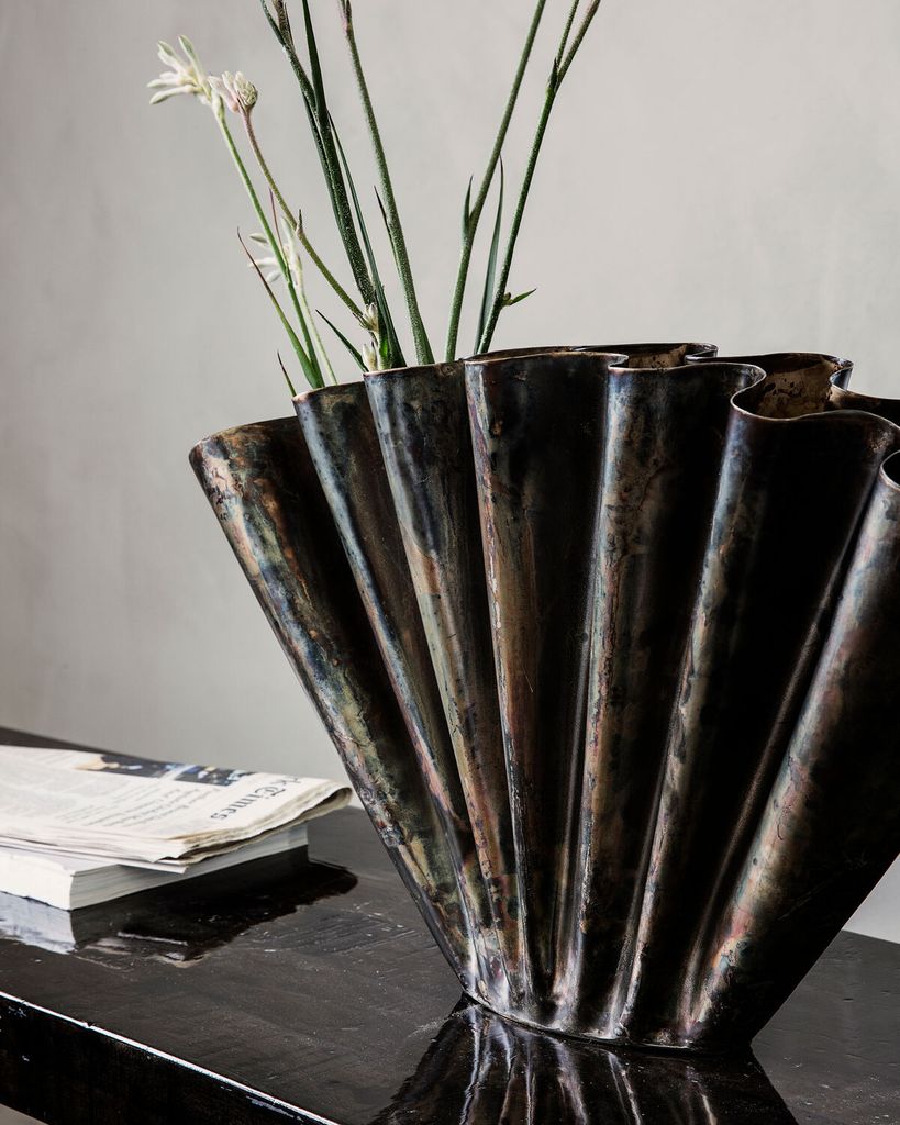 House Doctor Flood vas i antik brun järn ger ditt hem en rustik och industriell stil. Dess unika vikningar håller blommorna stilrent på plats.
