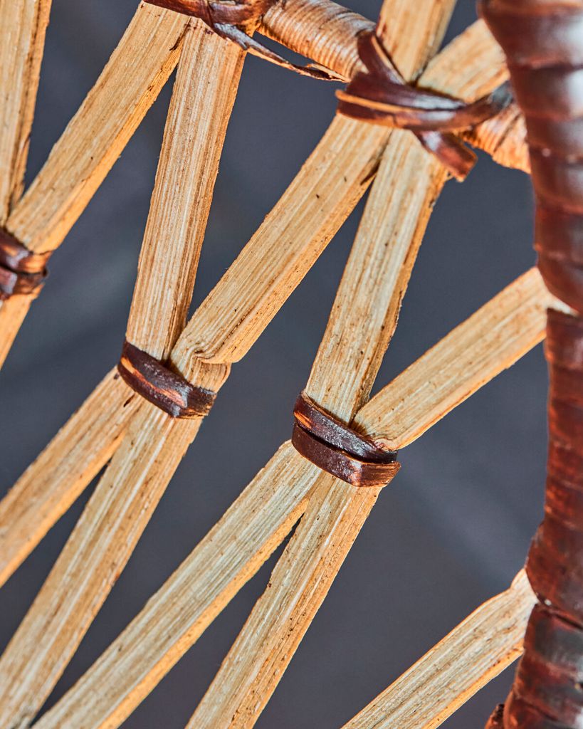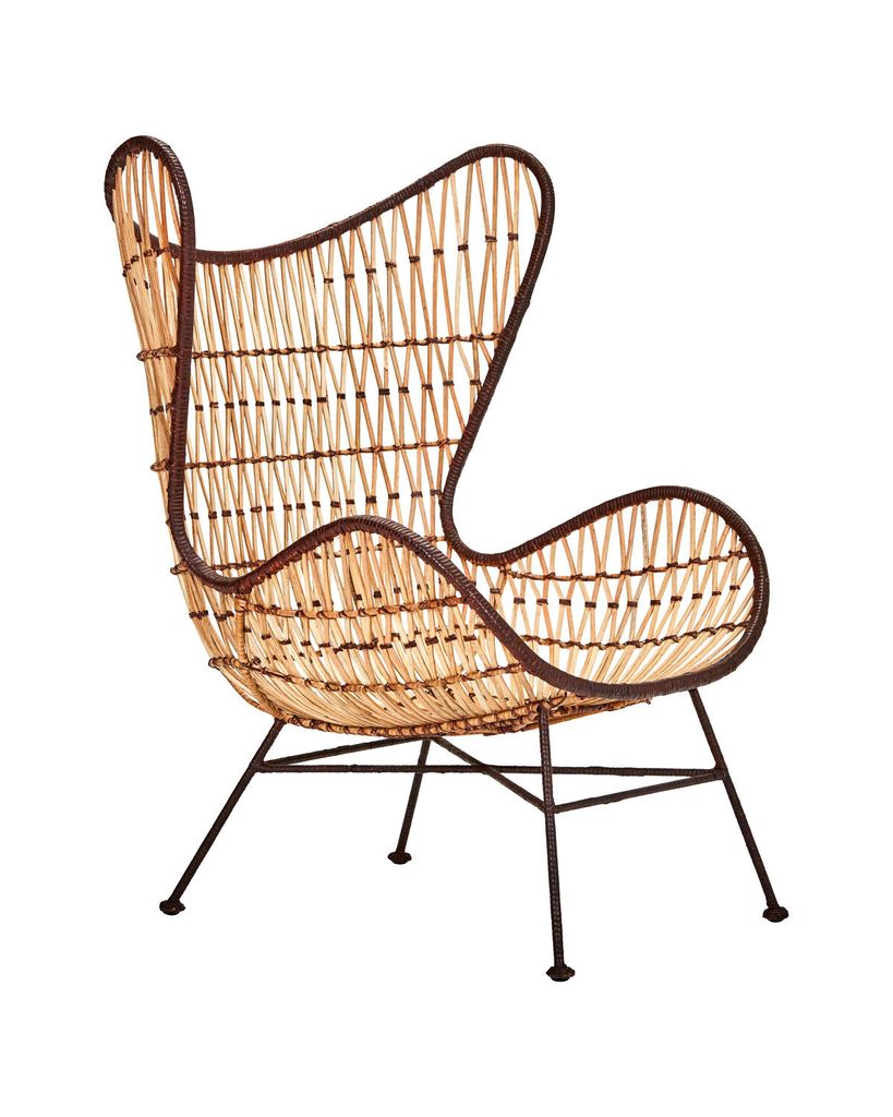 Elegant loungestol i naturlig rotting och svart järnram, perfekt för att tillföra stil och komfort till ditt vardagsrum.