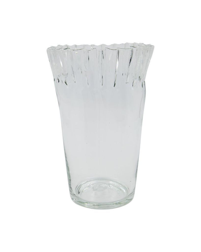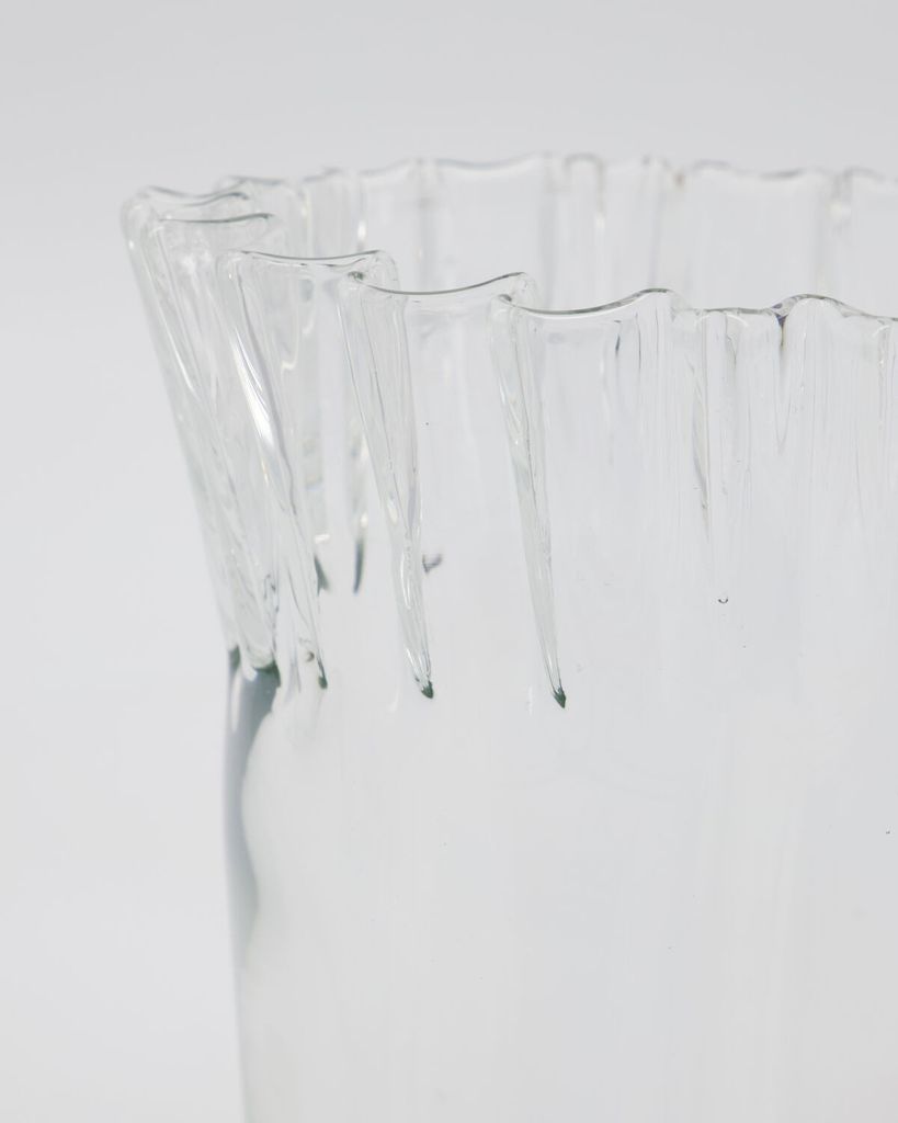 Elegant vas i munblåst klarglas med konstnärlig vikning. Perfekt för moderna hem och blomsterarrangemang.