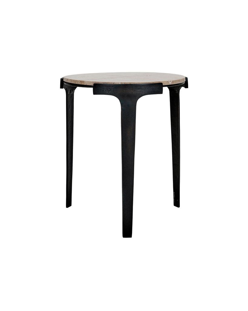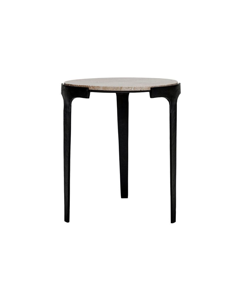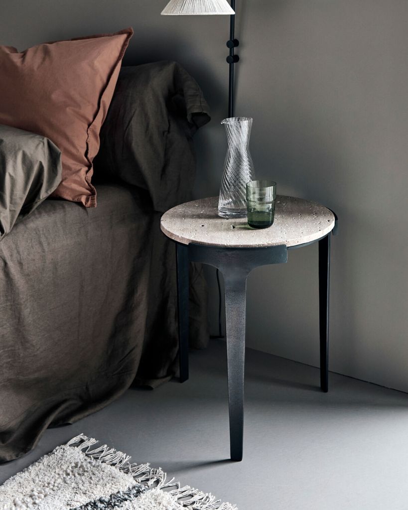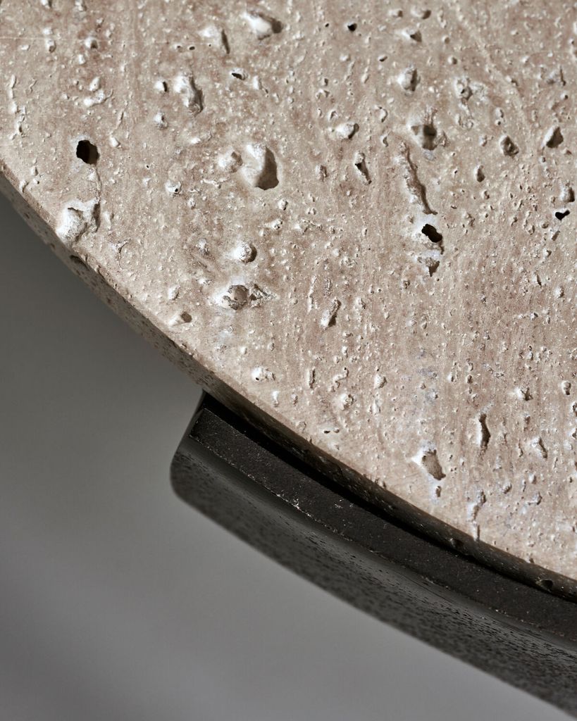 Fula sidobord i grå travertin och svarta aluminiumben kombinerar naturlig skönhet med modern design.