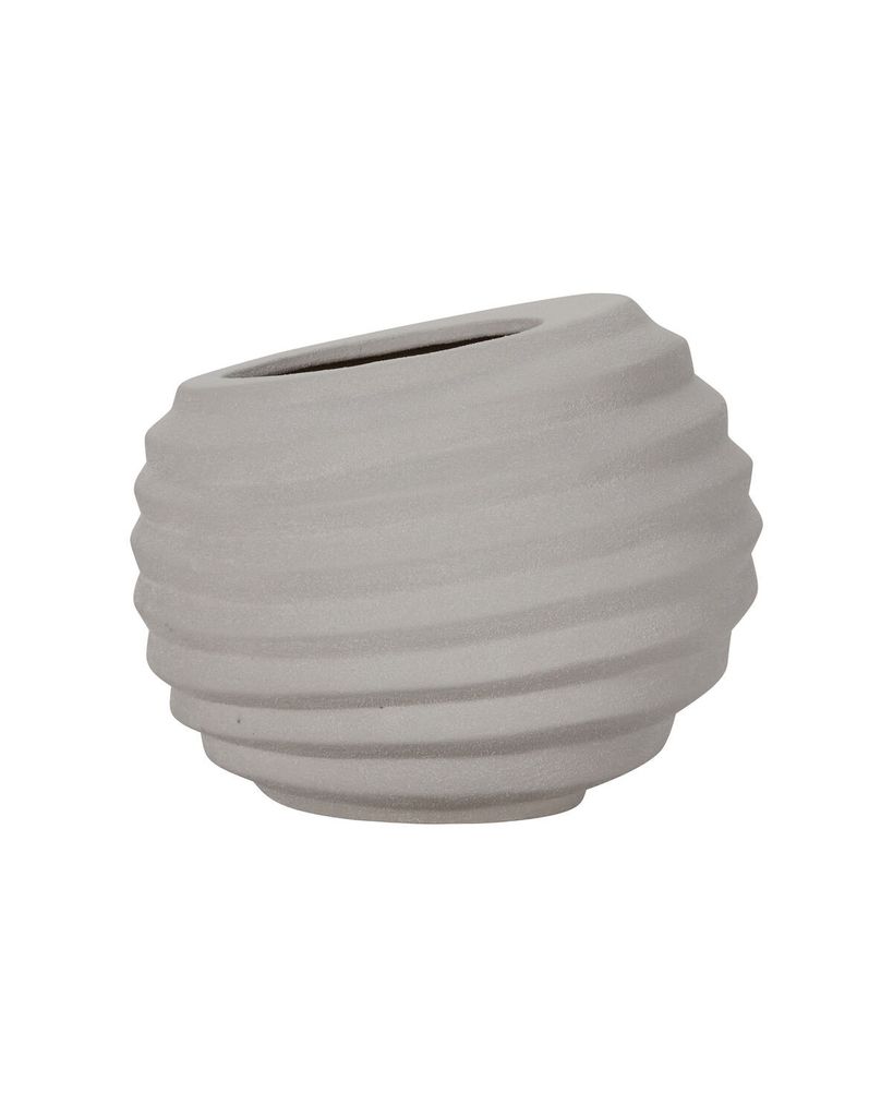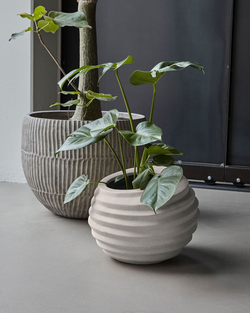 Ge ditt hem en uppfriskande touch med House Doctor Happ Kruka i off-white. Denna handgjorda kruka har en unik räfflad finish som skapar en subtil asymmetri och ger liv åt ditt utrymme. Den off-center öppningen tillför en modern twist till den klassiska krukformen. Krukan är tillverkad av poröst material med en rustik look, vilket innebär att ett fat eller underlägg rekommenderas för att skydda ytor. Placera den på soffbordet, sidobordet eller hyllan och låt den bli en naturlig del av din inredning med en lummig växt.