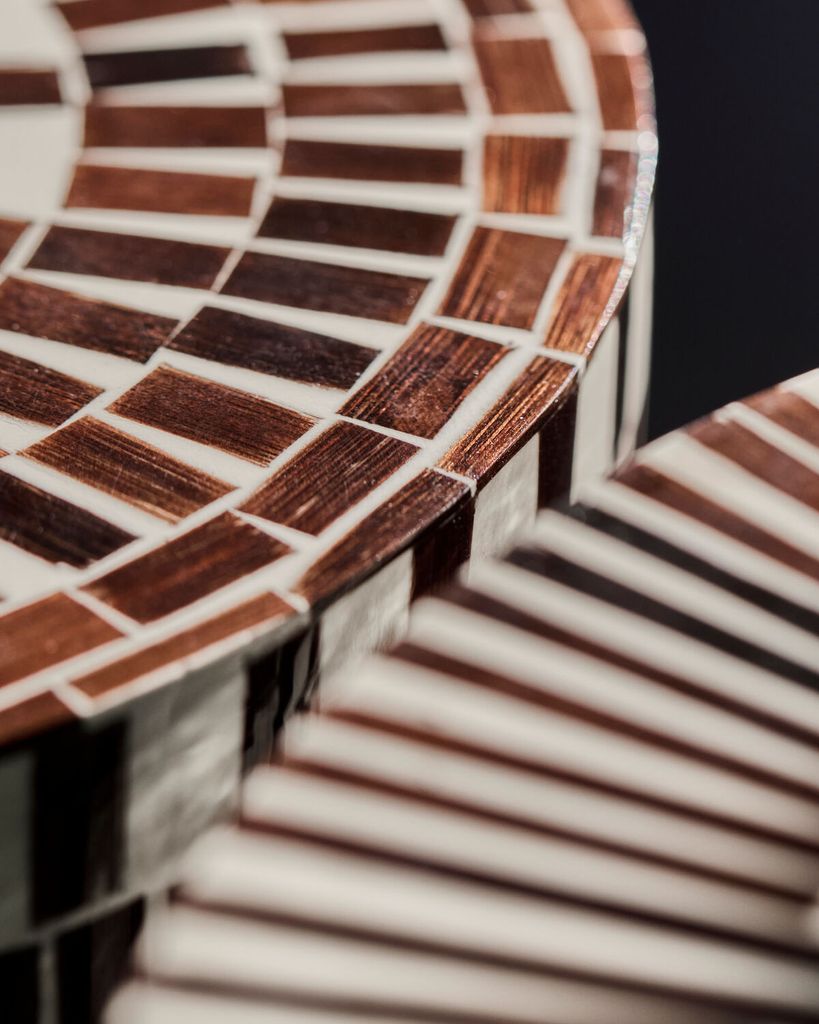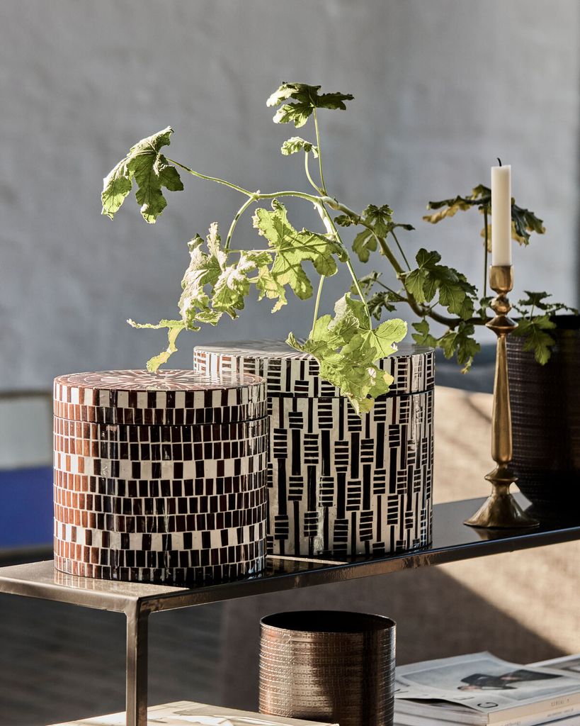 Upptäck eleganta förvaringslösningar med handgjorda detaljer. Setet i bambu och mosaik erbjuder både stil och funktion.