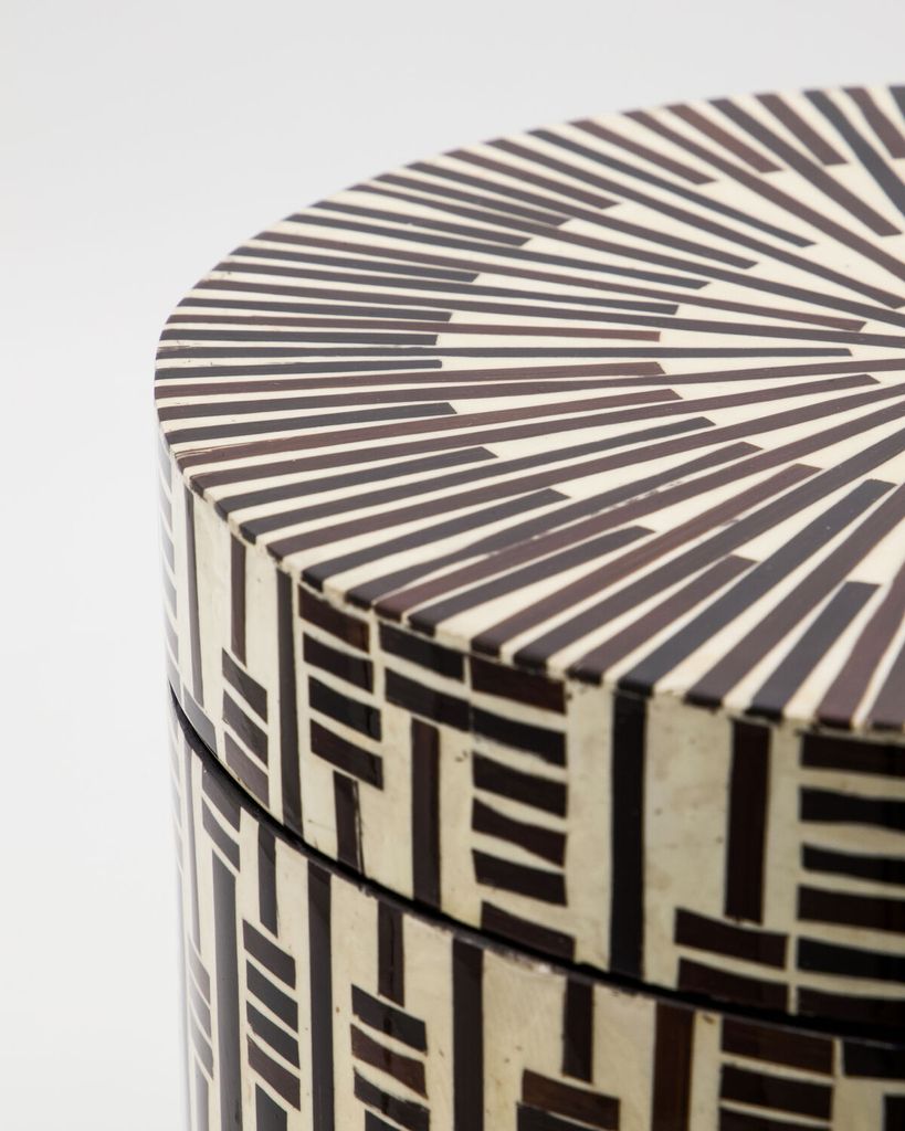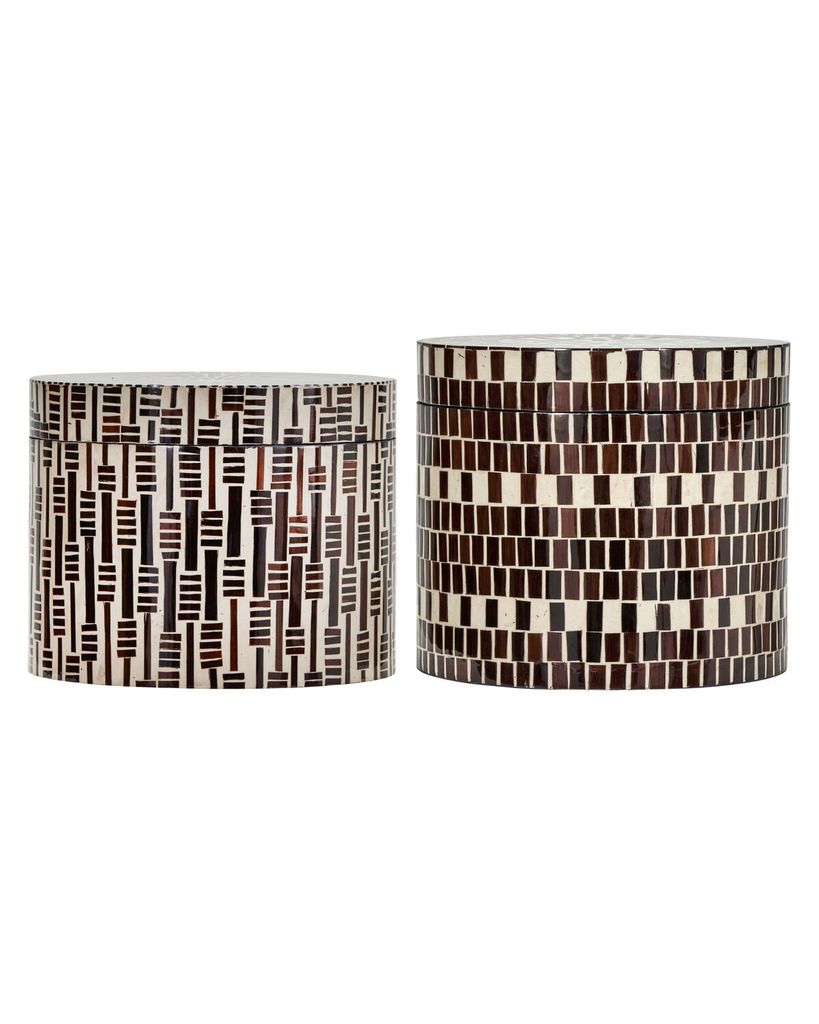 Förhöj ditt hem med House Doctor Lango Förvaringslådor i brun och natur. Dessa två lådor, med sina handgjorda bambu- och mosaikmönster, kombinerar praktisk förvaring med dekorativ elegans. Den rika, mörkbruna och gräddfärgade färgpaletten ger en tidlös känsla som passar både vardagsrum och sovrum. Den intrikata mosaiken fångar ljuset vackert, vilket gör varje låda unik. Perfekta för att organisera och dekorera, dessa lådor är ett måste för varje stilmedvetet hem.