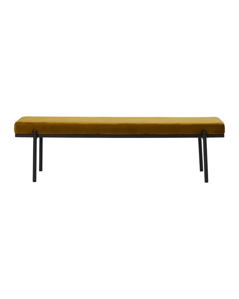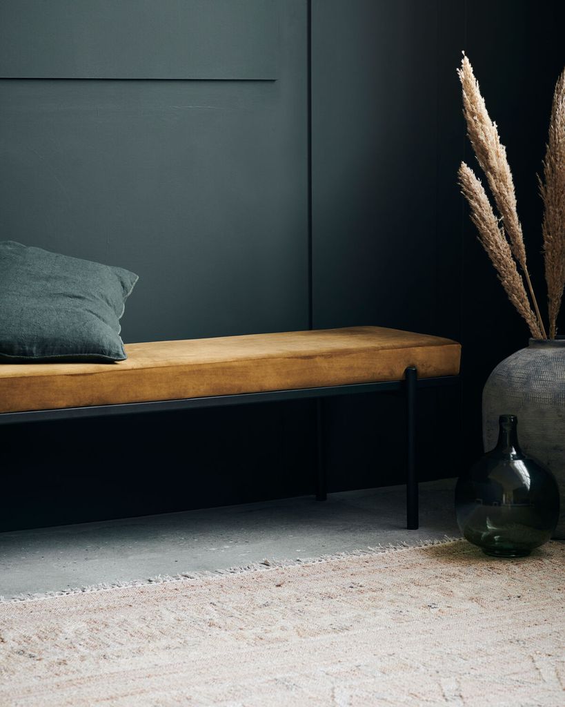 Stilren bänk i mörk oliv sammet som ger elegans till ditt hem. Perfekt i hallen eller vid sängkanten.