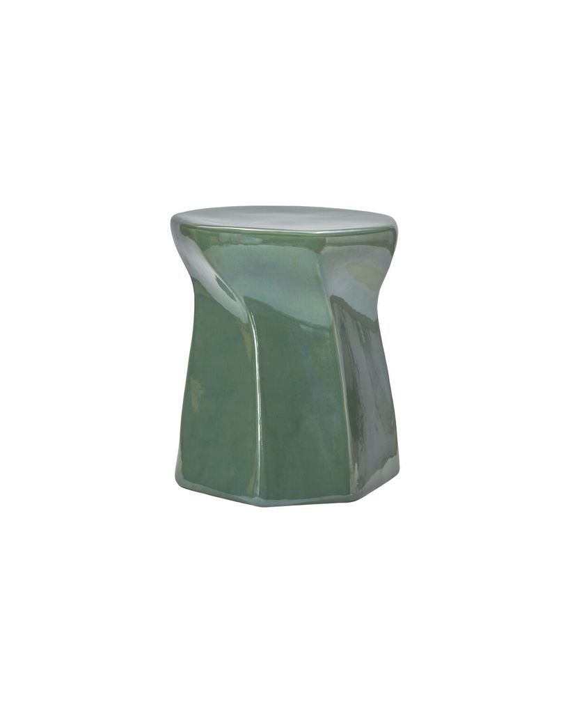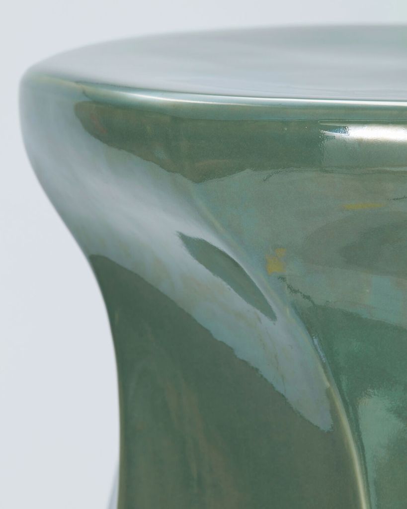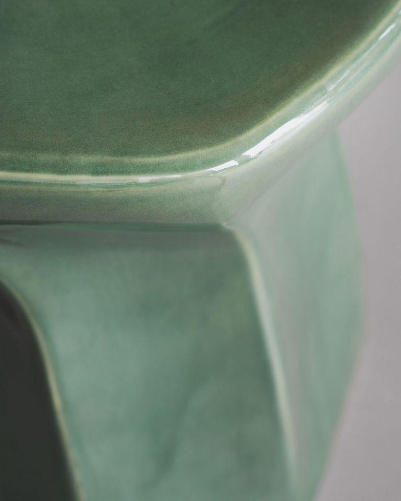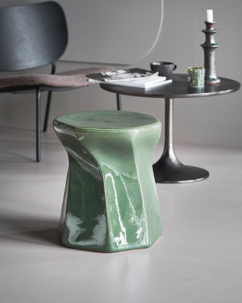 Handgjort stengodsbord i grön glaserad design, perfekt som sidobord eller dekorativ piedestal.
