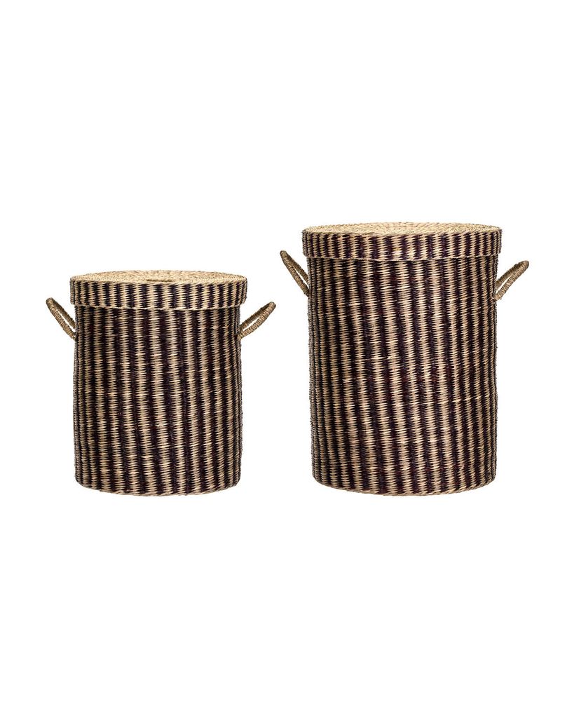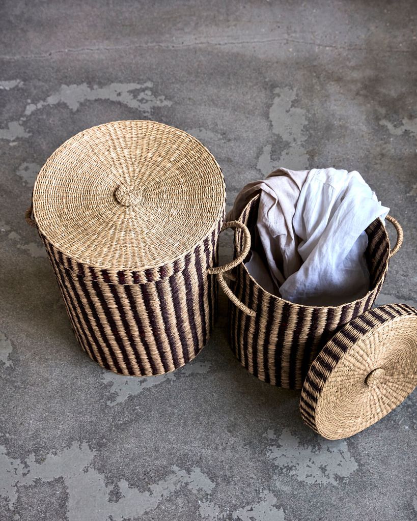 Handvävda tvättkorgar i sjögräs med brunrandig design och integrerad metallram för stil och stabilitet.