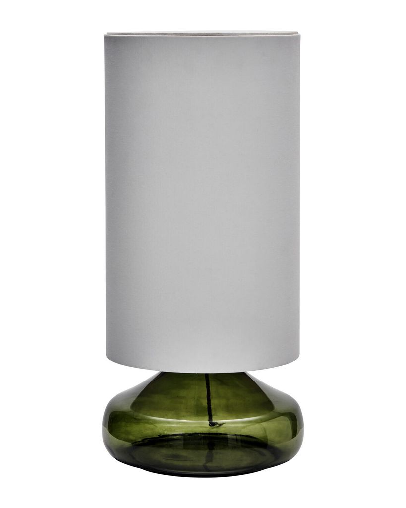 Elegant bordslampa med grön glasbas och offwhite skärm. Modern design, 2 m textilkabel, E27 fattning.