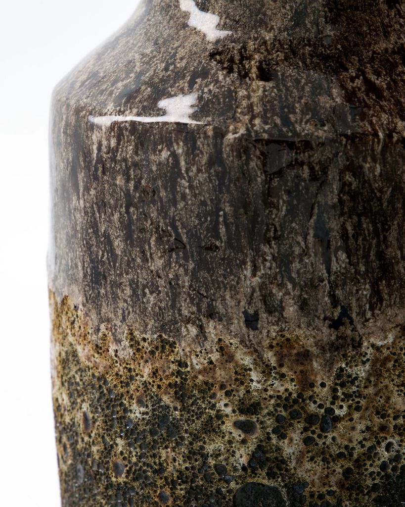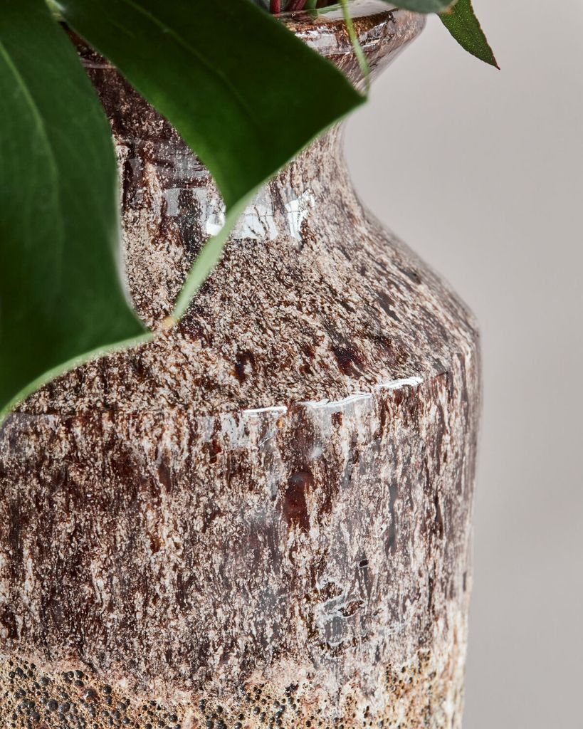 Handgjord vas i antikbrun stengods med unik glasyr. Varje exemplar är en konstnärlig skapelse.