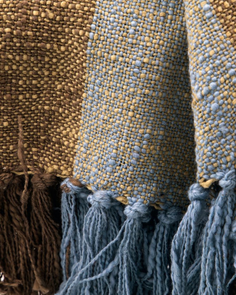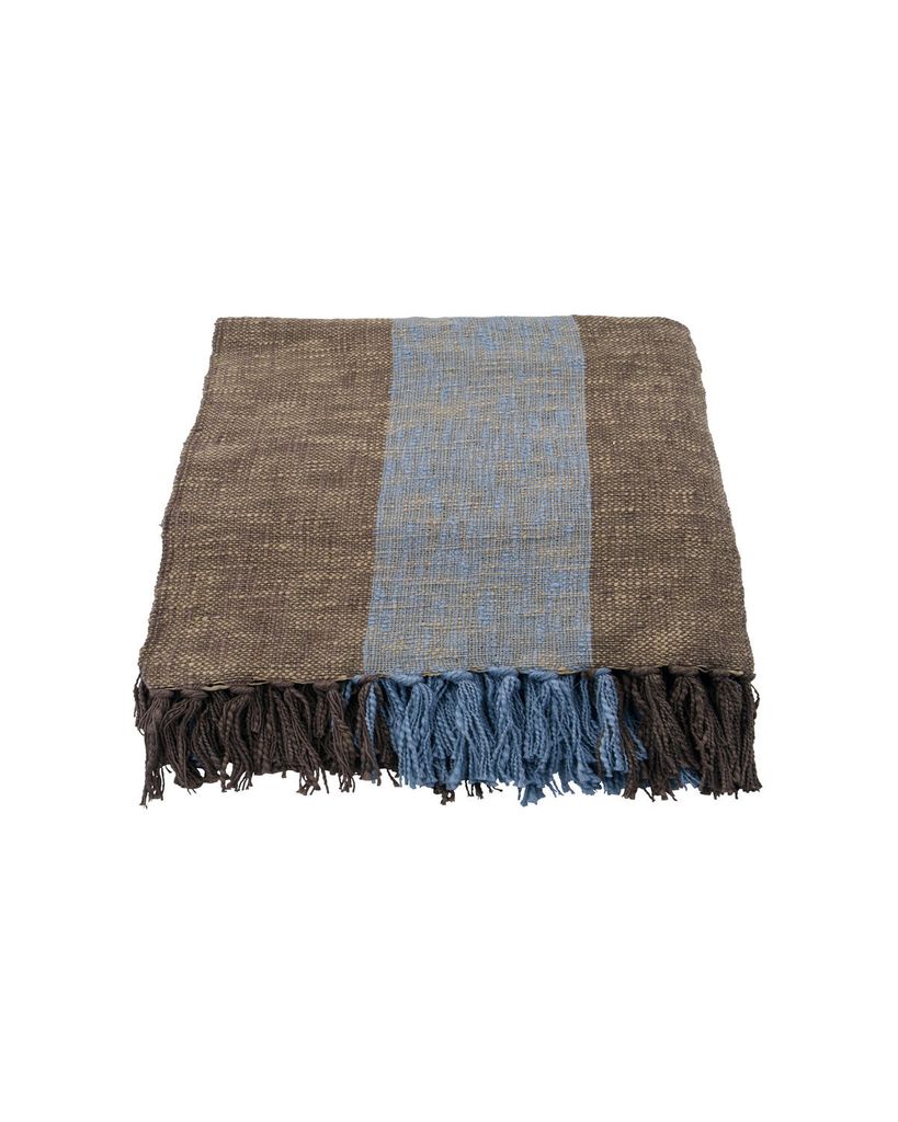 Handvävt överkast i brun och ljusblå bomull med fransar, perfekt för ett ombonat hem.