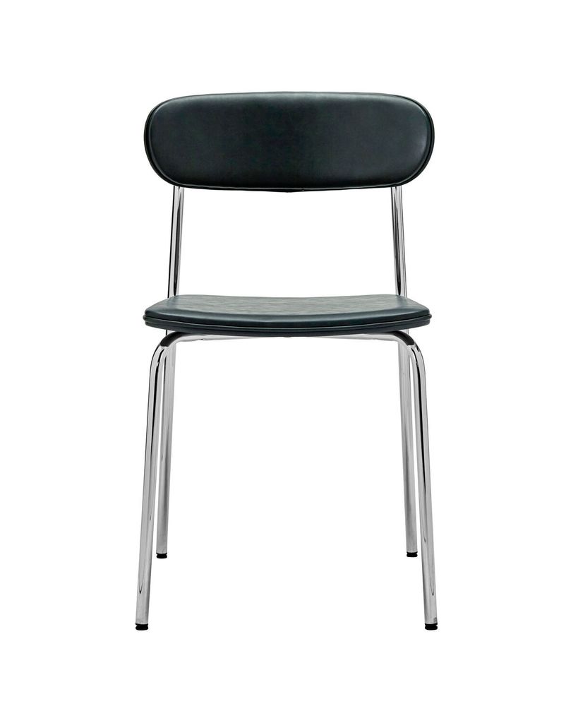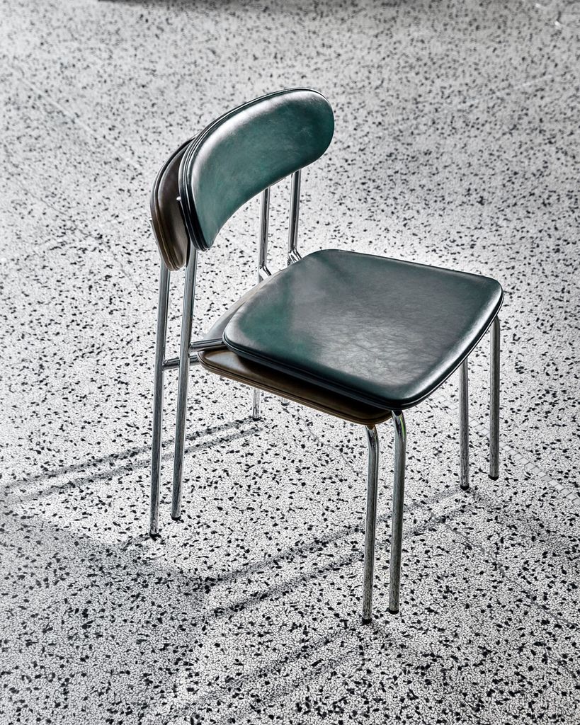 Elegant stapelbar stol med kromad bas och läderlook i mörkgrönt. Perfekt för både kök och matplats.