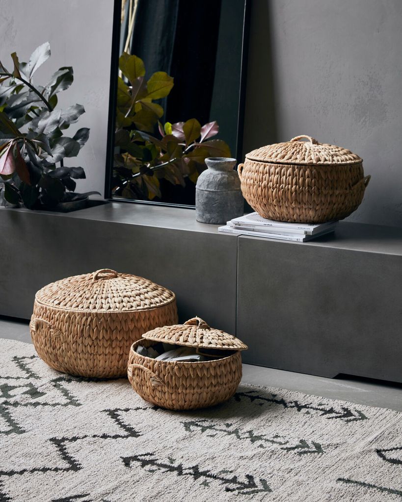 Handvävda korgar i vattenhyacint med lock och handtag. Perfekta för elegant förvaring i alla rum.