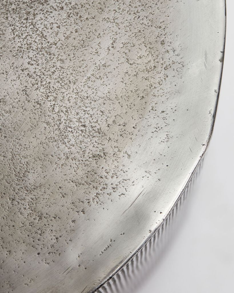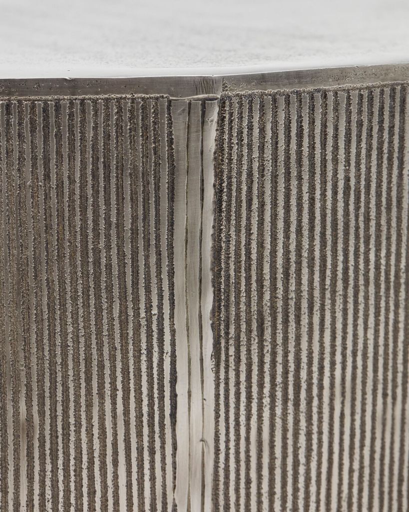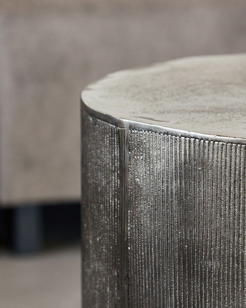 Förhöj ditt vardagsrum med det stilrena Rota sidobordet från House Doctor. Tillverkat av hållbart aluminium har bordet en sofistikerad borstad silverfinish som ger en diskret men ändå slående elegans. Den rundade formen och de vertikala spåren i designen bidrar till en modern känsla, medan den avsiktligt ojämna ytan ger en unik karaktär. Perfekt att placera bredvid soffan för att visa upp favoritdekorationer, såsom en elegant glasvas. Använd gärna bordsunderlägg för att skydda den texturerade ytan. Kombinera gärna med matchande möbler för en sammanhängande inredningsstil.