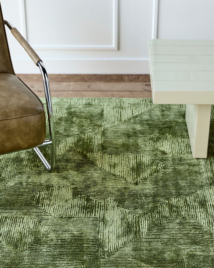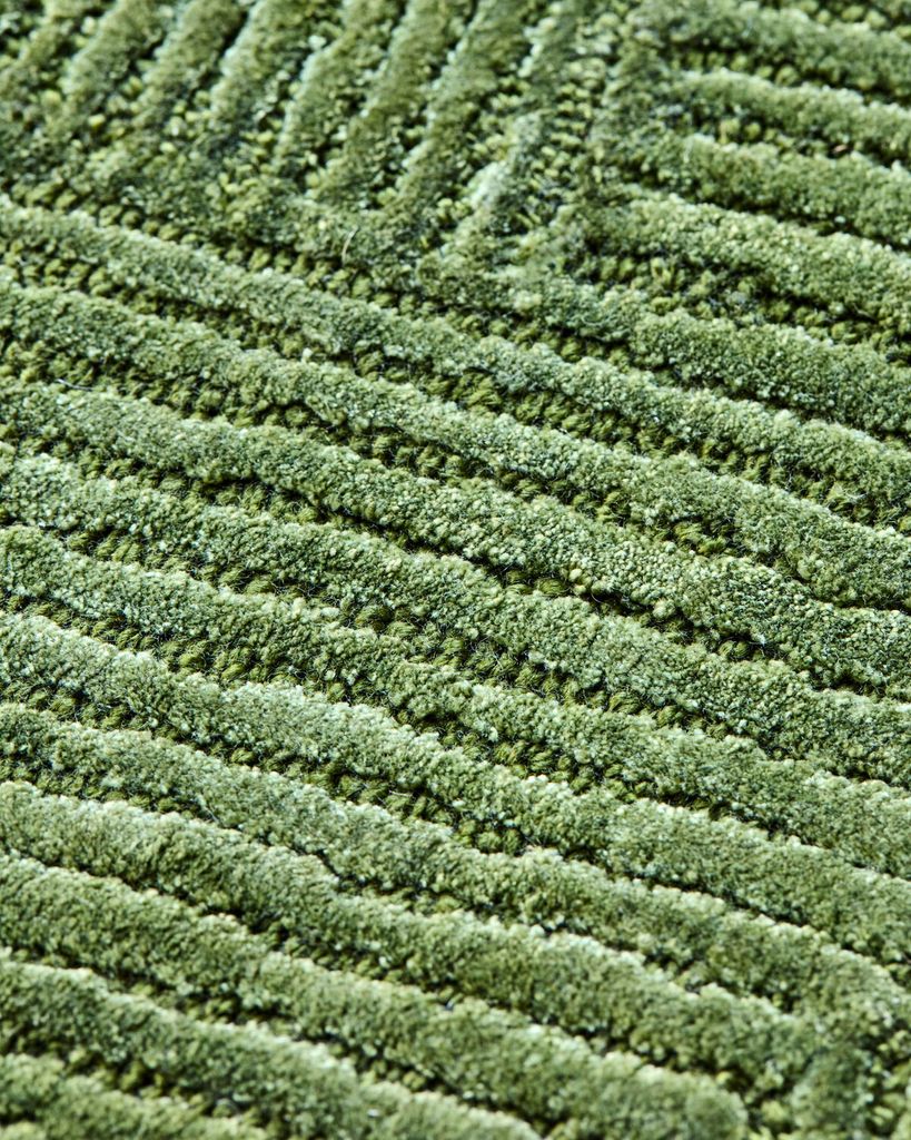 Handgjord grön matta med glansigt, grafiskt mönster som ger sofistikerad elegans till varje rum.