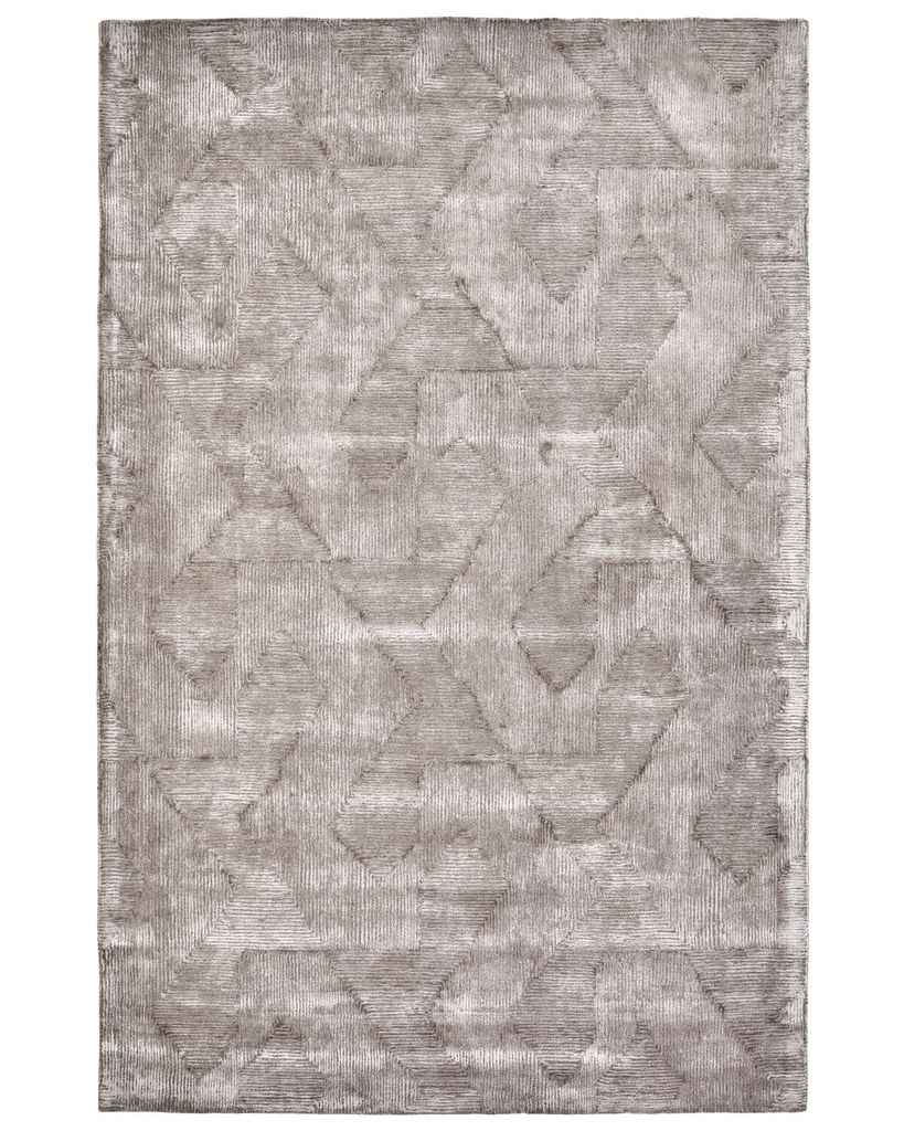 Sandfärgad handgjord matta med elegant glans och grafiskt mönster, perfekt för att förhöja hemmets estetik och komfort.