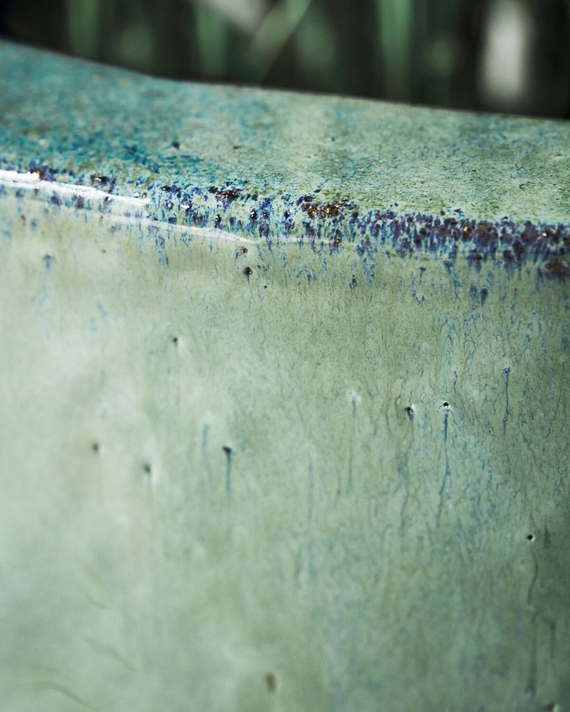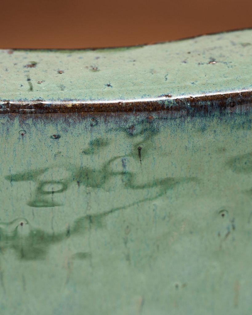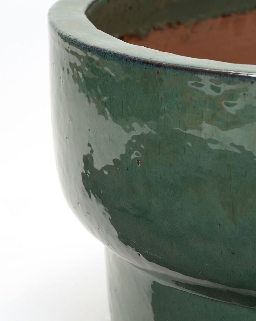 Grön keramikkruka med unik finish, perfekt för utomhusbruk. Tål -20°C; stilren och funktionell.