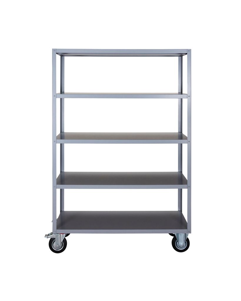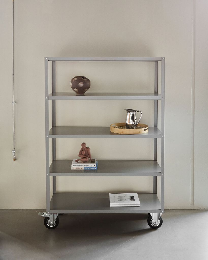 En stilren och mobil hyllvagn i grått stål för flexibel och robust förvaring med industriell design.