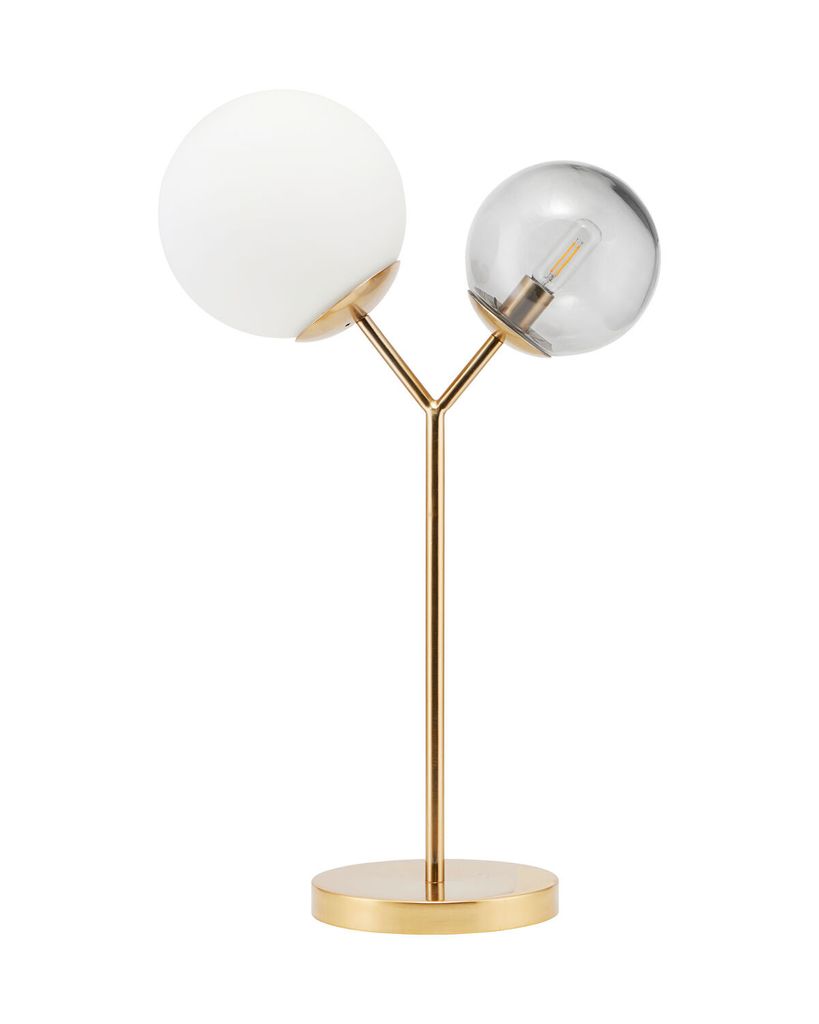 House Doctor Twice bordslampa kombinerar mässing och glas för en stilren belysning. Med unika vita och rökgrå glasskärmar skapar den en varm atmosfär.