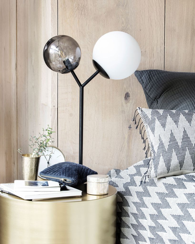 Elegant bordslampa med två glaskulor i svart och vitt. Rå design i järn för modern inredning.