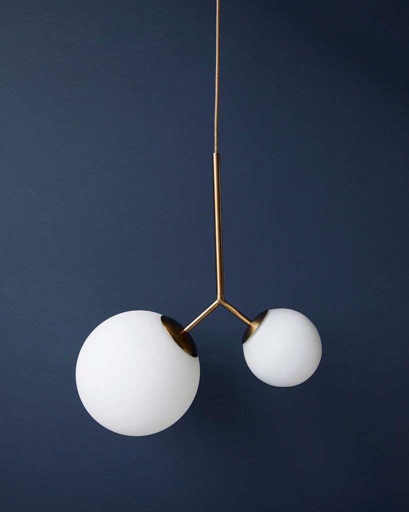 Stilren och elegant taklampa med asymmetrisk design och mässingsdetaljer för unik atmosfär.