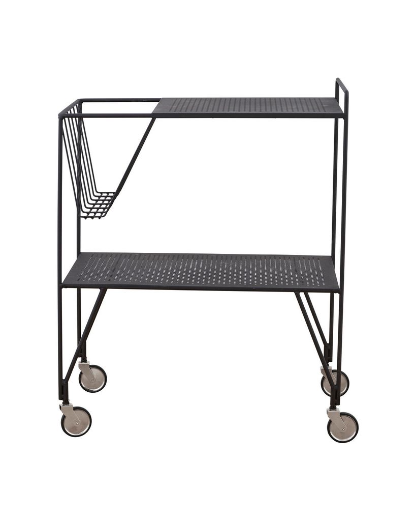 Stilren serveringsvagn i svart stål med två hyllor och smart sidohållare, perfekt för flexibel förvaring.