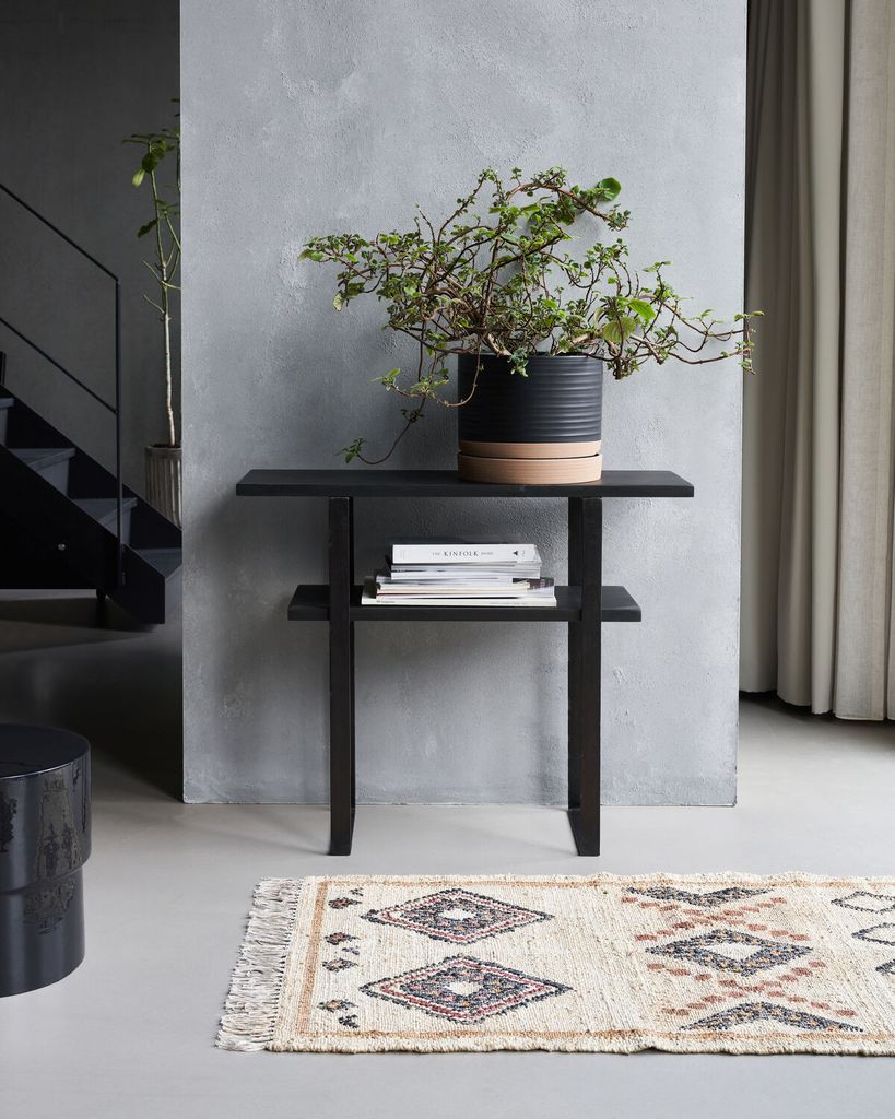 House Doctors konsolbord Woda erbjuder en modern elegans som passar perfekt i både små och stora utrymmen. Bordet är tillverkat i helsvart mangoträ och har en robust järnram, vilket ger en industriell men ändå sofistikerad känsla. Dess minimalistiska design lyfter fram de små detaljerna och skapar en perfekt yta för att visa upp dina favoritprylar, böcker och växter. Med Woda konsolbord får du en tidlös möbel som enkelt smälter in i alla rum och aldrig blir omodern.