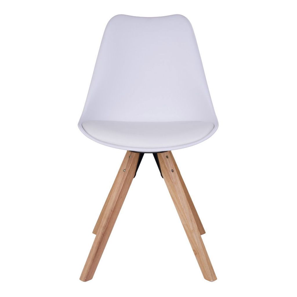 Stilren matstol i vit PU-läder med robusta ben i gummiträ, perfekt för moderna hem.
