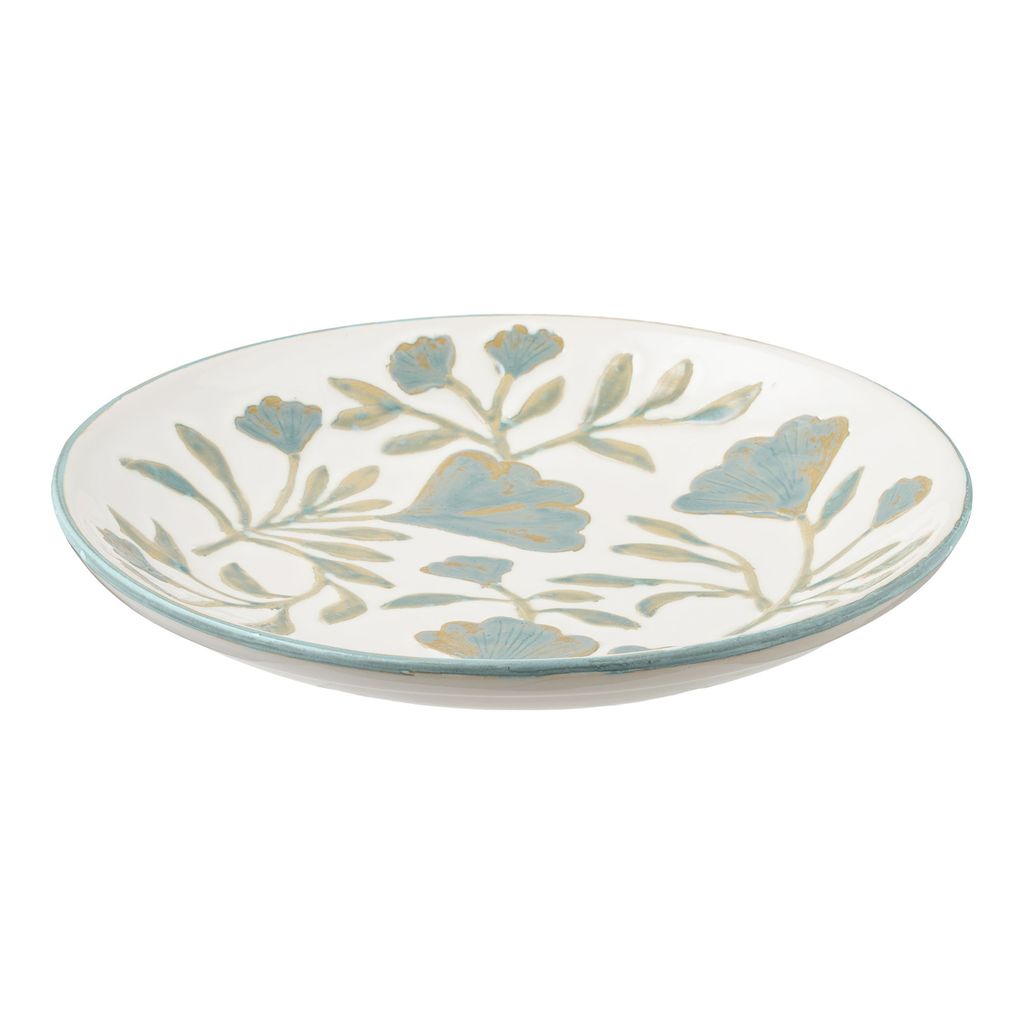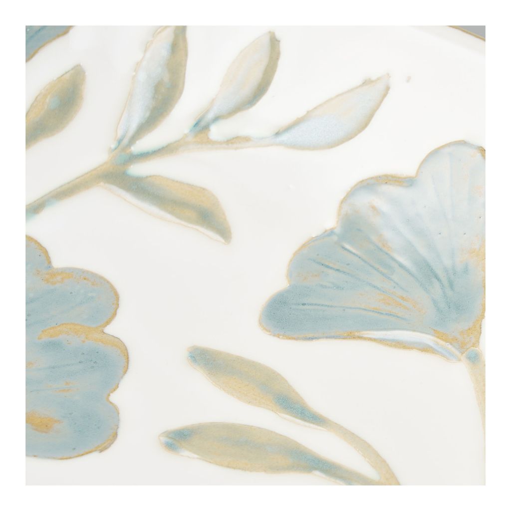 Designen är stilren med ett vackert handmålat blommönster i mjuka blå och gyllene toner mot en vit bakgrund. Detta gör brickan till ett utmärkt val för både servering och dekoration i hemmet.