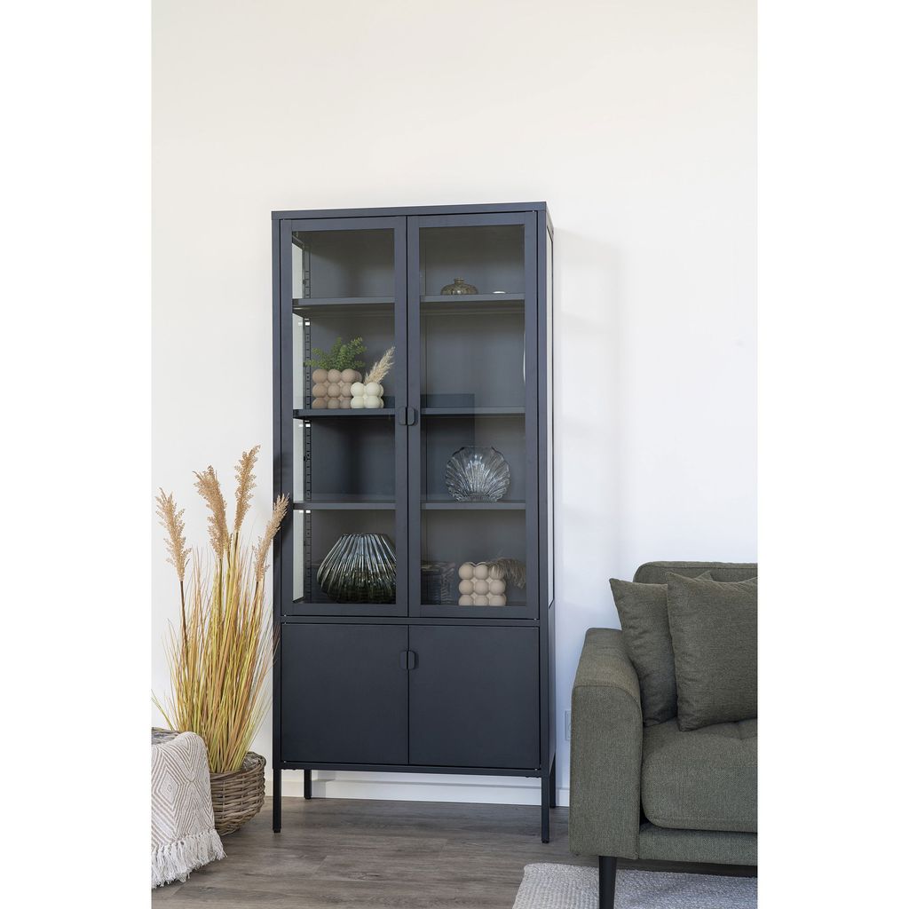 Elegant svart vitrinskåp i stål och glas, perfekt för modern inredning med generöst förvaringsutrymme.