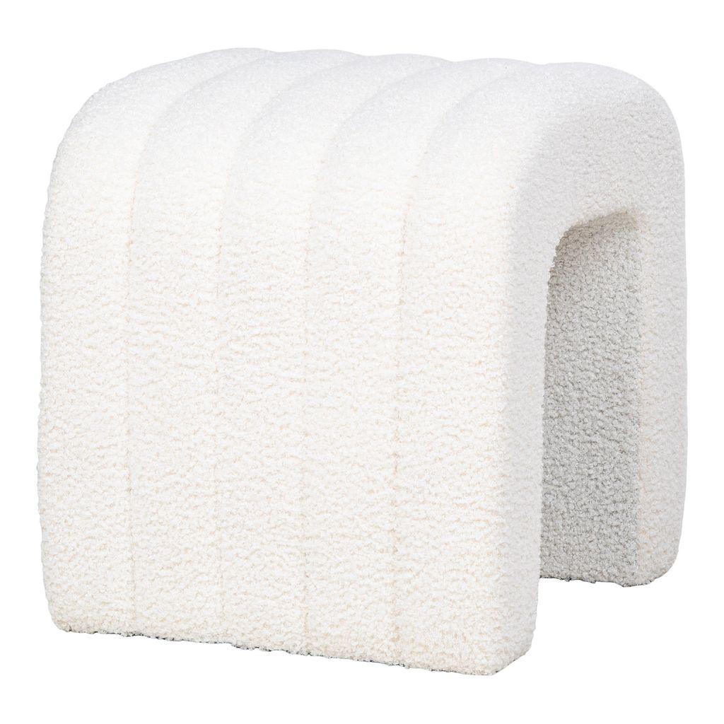 Elegant vit puff i teddytyg, perfekt som extra sittplats eller dekorativt inslag i hemmet.