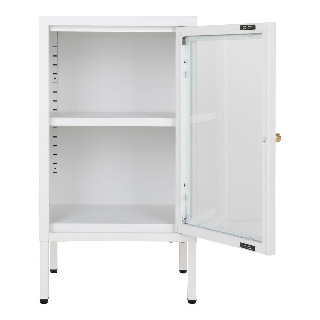 Skåpet har två hyllplan som kan justeras efter behov, vilket gör det idealiskt för både små och stora föremål. Den eleganta glasdörren stängs med ett snyggt mässingshandtag som ger en touch av lyx. Dess kompakta design gör det lätt att placera i mindre utrymmen, samtidigt som det erbjuder maximal förvaring.