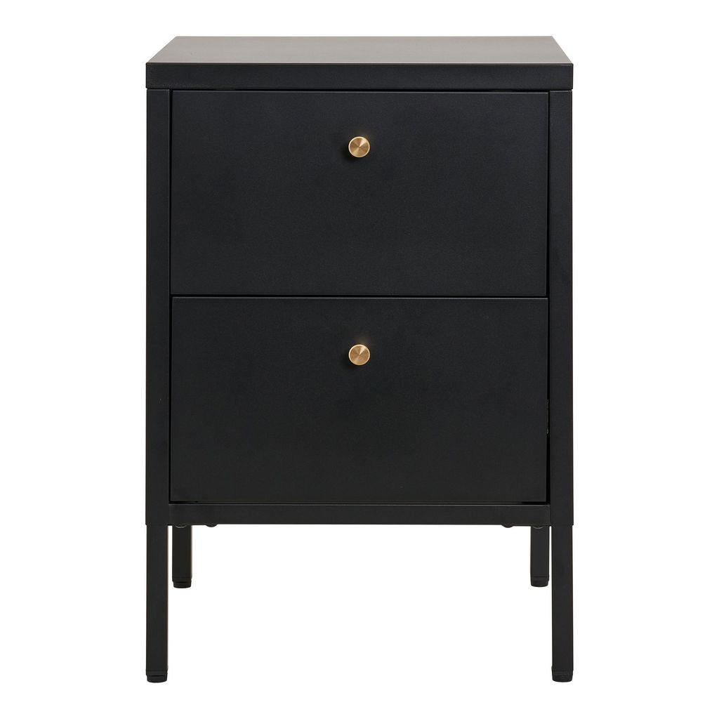 Elegant byrå i stål med mässingsknoppar, svart färg och två rymliga lådor.