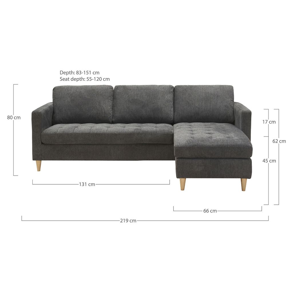 Den generösa sittbredden och djupet bidrar till en avkopplande sittupplevelse, medan den avtagbara schäslongen gör soffan mångsidig och anpassningsbar till olika rumslayouter.